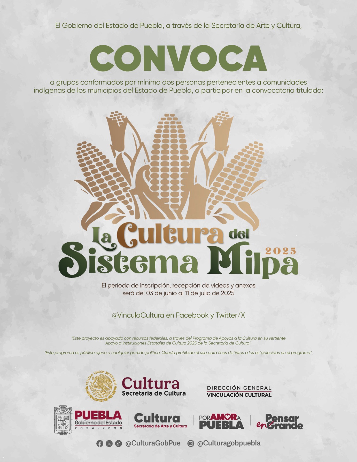 CIUDAD DE PUEBLA, Pue.- Por Amor a Puebla y a las prácticas, manifestaciones y conocimientos culturales de agricultores de pueblos originarios, el gobierno estatal, por medio de la Secretaría de Arte y Cultura, invita a inscribirse en la convocatoria “La Cultura del Sistema Milpa”, cuyas propuestas de participación se recibirán hasta las 18:00 horas del viernes 11 de julio.