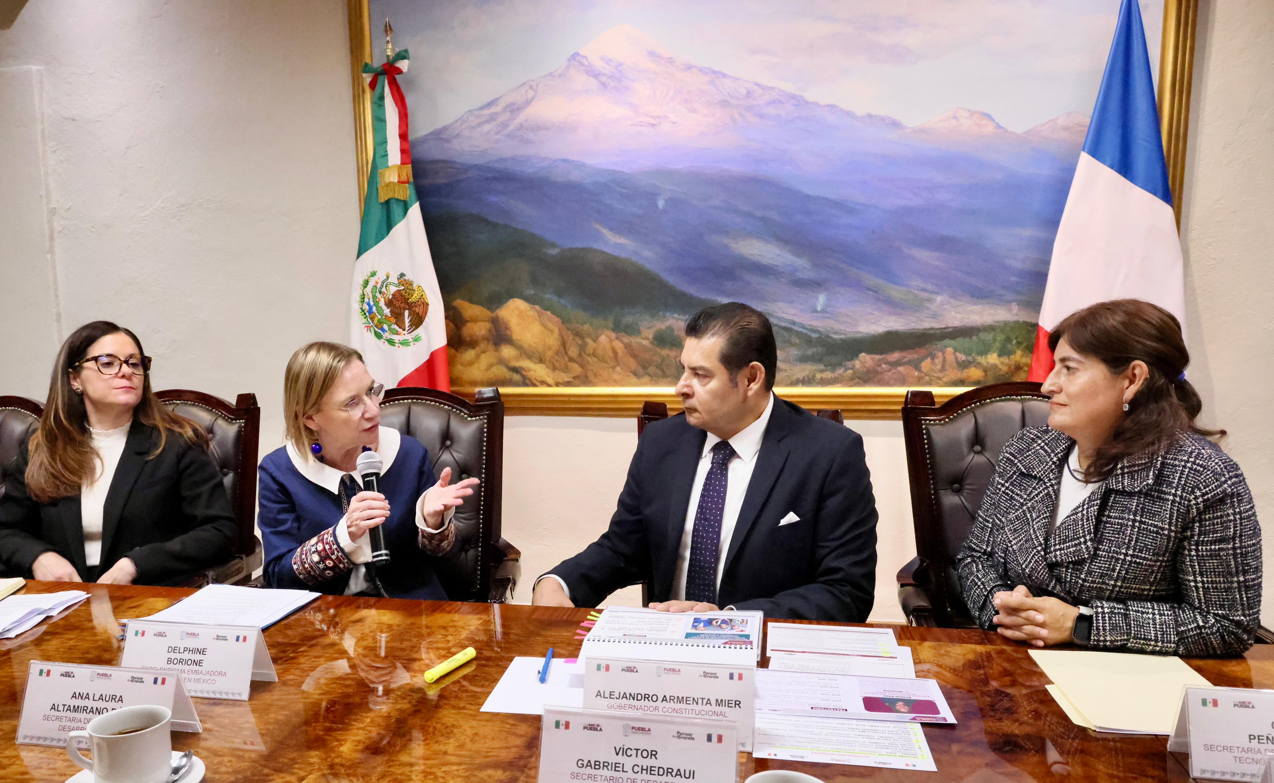 CIUDAD DE PUEBLA, Pue. – En el marco de una reunión encabezada por el Gobernador Alejandro Armenta y la Embajadora de Francia en México, Delphine Borione, autoridades de ambos países reafirmaron su compromiso de fortalecer los lazos de cooperación bilateral con acciones concretas en materia educativa, tecnológica, cultural y económica, alineadas con el Plan México y el Plan Francia 2030.
