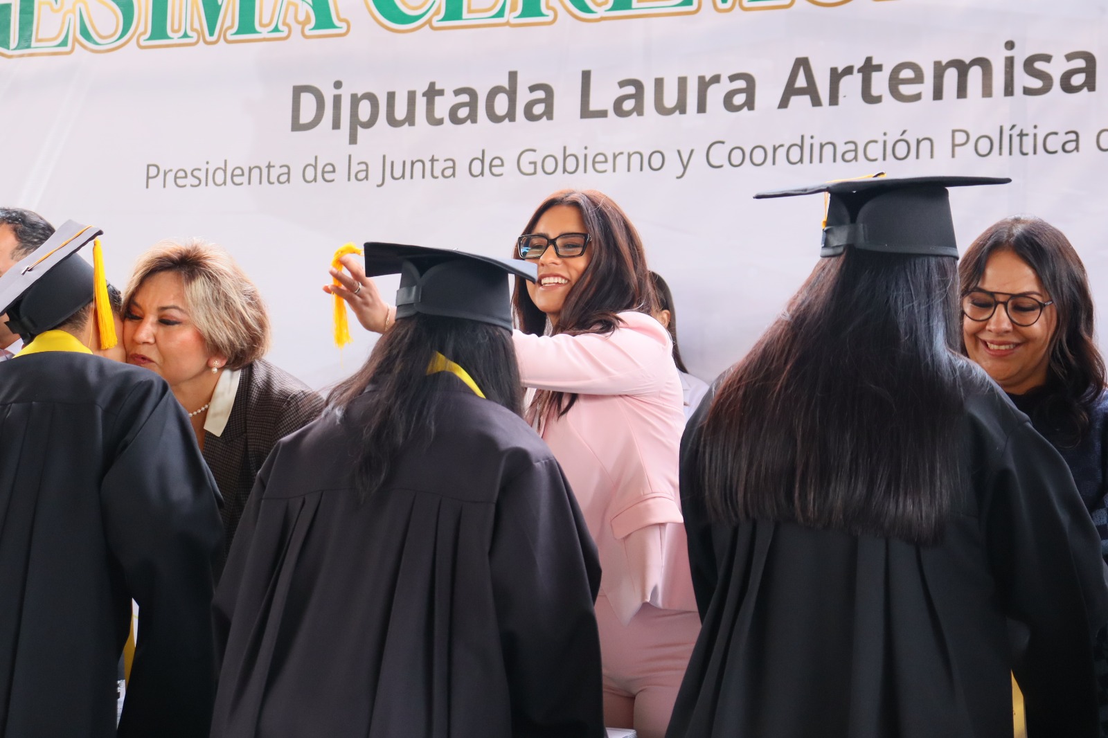 El acto protocolario contó con la presencia de representantes de los tres órdenes de gobierno, entre quienes destacaron la diputada federal Marilyn Ballesteros; la diputada local Floricel González, en representación de la diputada Laura Artemisa García Chávez, madrina de la generación; y la presidenta municipal de Teziutlán, Karla Victoria Martínez Gallegos.