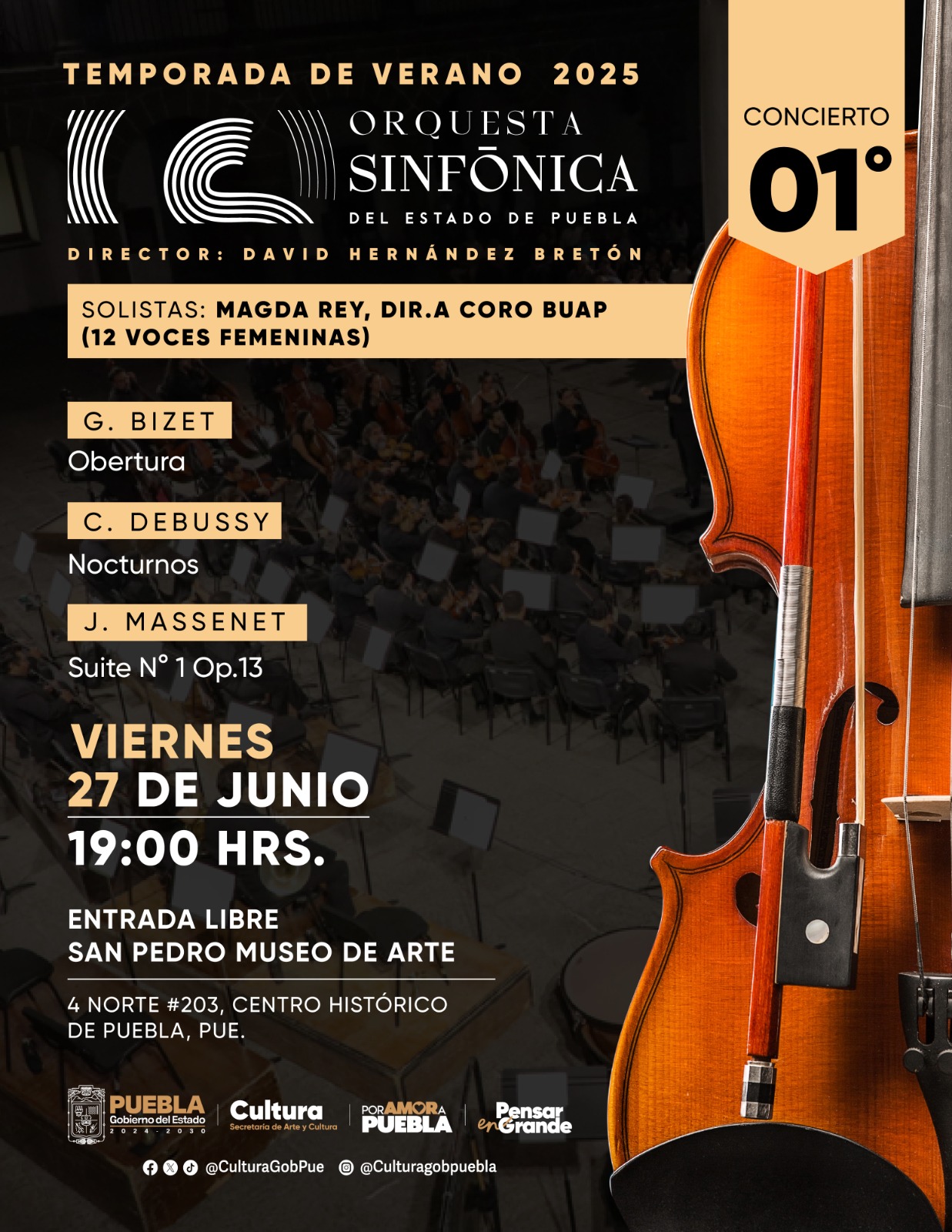 CIUDAD DE PUEBLA, Pue.- El gobierno estatal encabezado por Alejandro Armenta, a través de la Secretaría de Arte y Cultura, dará inicio a los conciertos de la Temporada de Verano de la Orquesta Sinfónica del Estado de Puebla (OSEP), que se llevarán a cabo todos los viernes del 27 de junio al 23 de septiembre, a las 19:00 horas, en el patio central de San Pedro Museo de Arte.