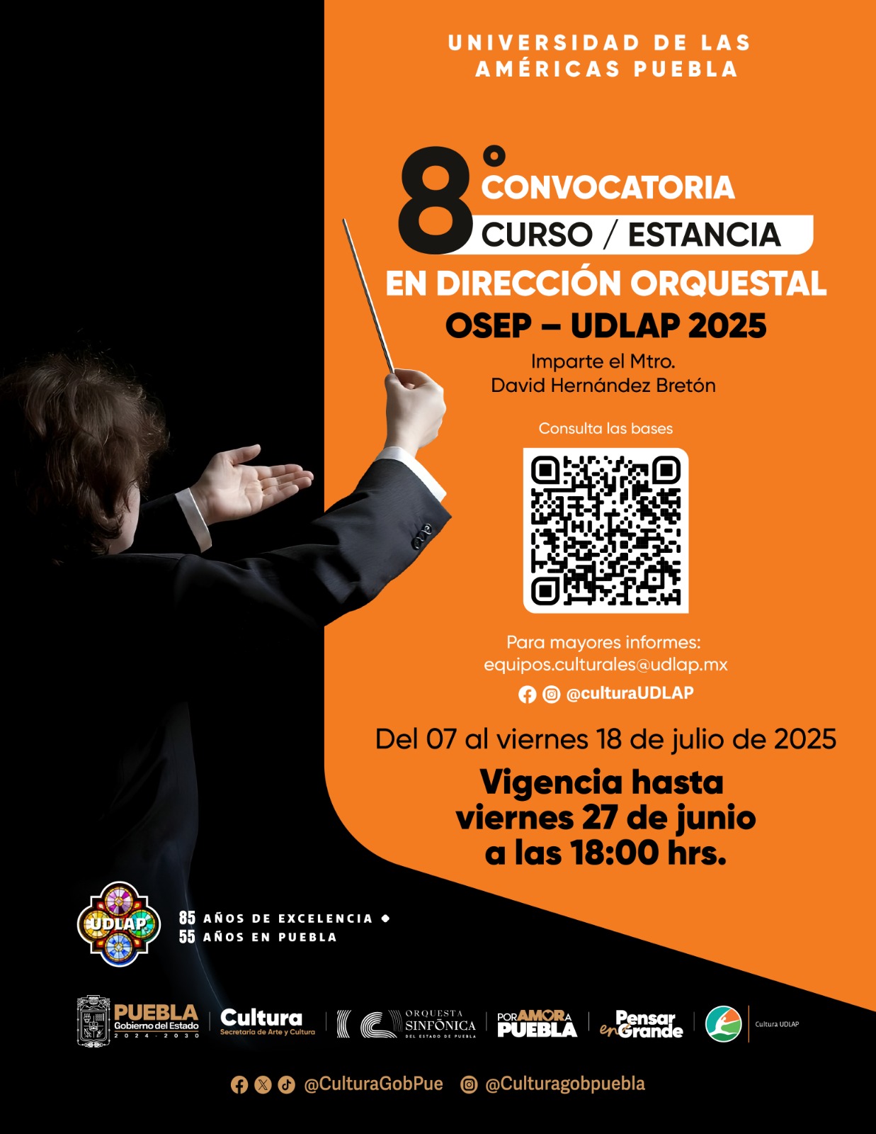 CIUDAD DE PUEBLA, Pue.- Por segunda ocasión, el gobierno estatal encabezado por Alejandro Armenta, a través de la Secretaría de Arte y Cultura, y la Universidad de las Américas Puebla (UDLAP), colaborarán para ofrecer el curso estancia en Dirección Orquestal, que será impartido por el director de la Orquesta Sinfónica del Estado de Puebla (OSEP), David Hernández Bretón, del lunes 07 al viernes 18 de julio del presente año.