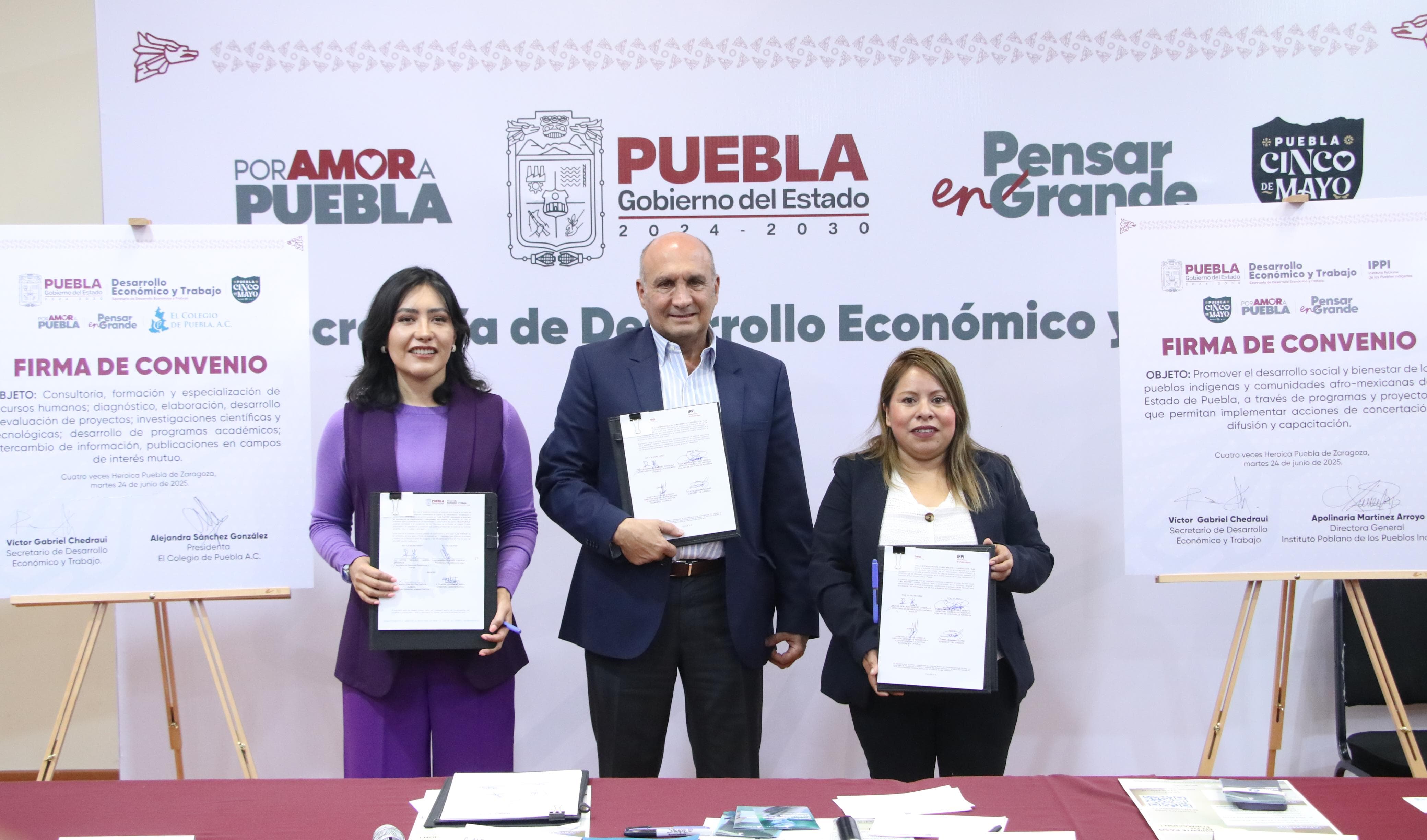 CIUDAD DE PUEBLA, Pue. – El gobierno de Alejandro Armenta impulsa el desarrollo económico de los pueblos indígenas y acceso a consultoría en tecnología e investigación para este sector social, a través de la colaboración entre la Secretaría de Desarrollo Económico y Trabajo (SEDETRA), el Instituto Poblano de los Pueblos Indígenas (IPPI) y el Colegio de Puebla.