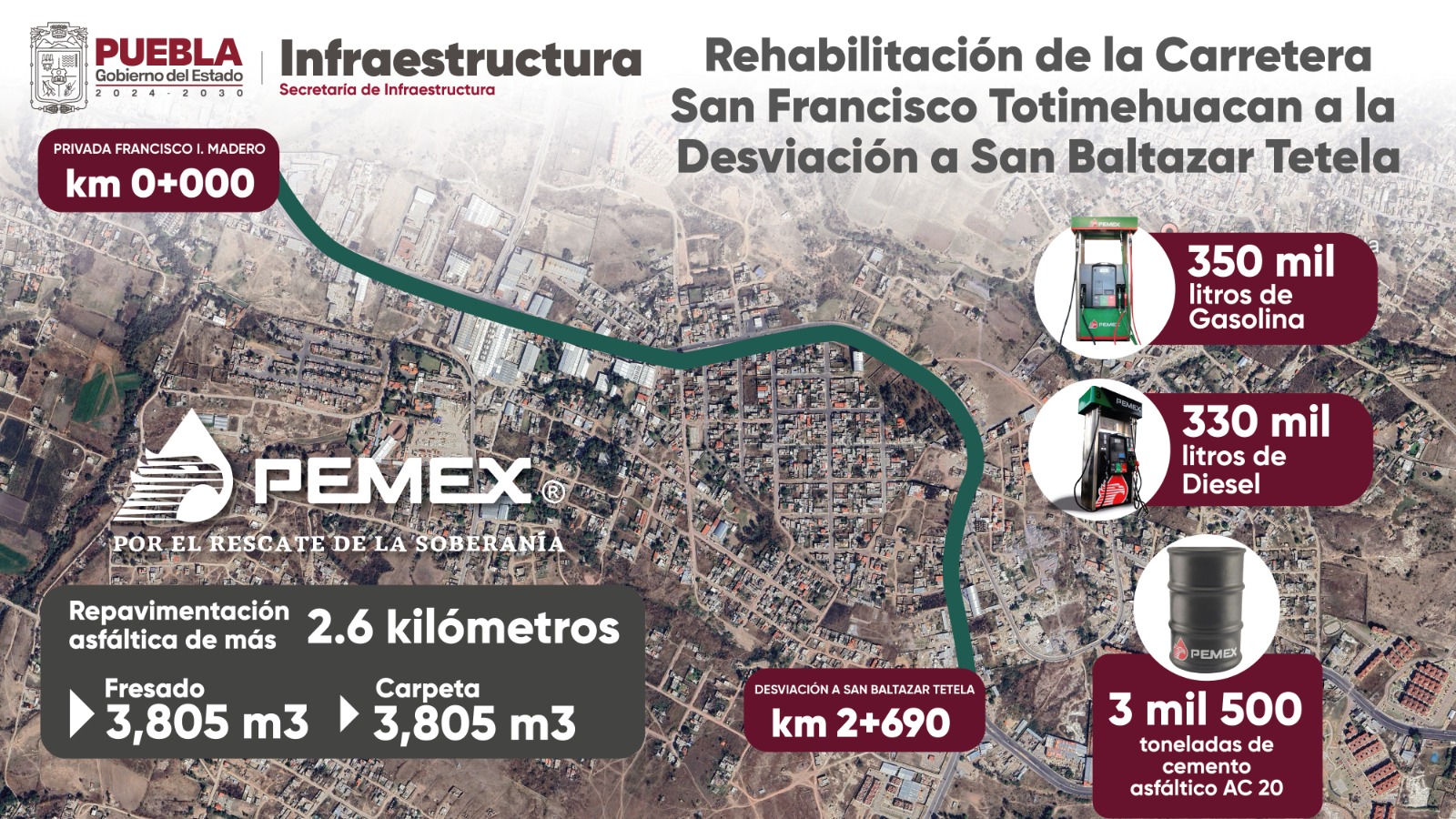 *Carretera San Francisco Totimehuacan-Presa Manuel Ávila Camacho-Los Ángeles Tetela, intervendrán 16 mil metros cuadrados (23 calles).