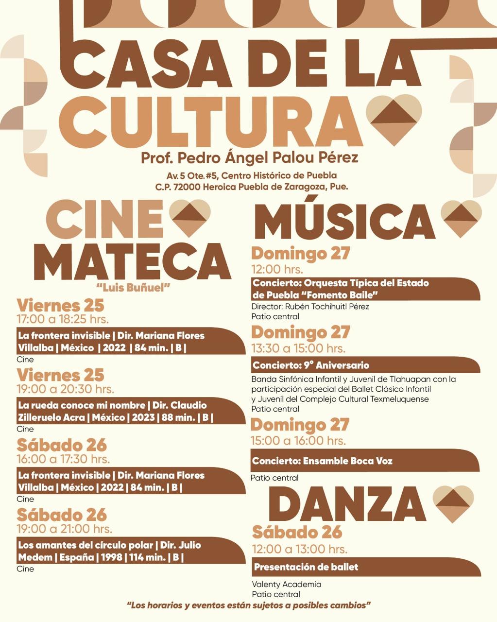 Por otro lado, la Cinemateca “Luis Buñuel” proyectará las cintas “La frontera invisible”, “La rueda conoce mi nombre” y “Los amantes del círculo polar”. La programación está disponible en la cartelera de fin de semana, publicada en las redes sociales de la Secretaría de Arte y Cultura: Facebook (Secretaría de Cultura Puebla), X (@CulturaGobPue) e Instagram (@culturagobpuebla).