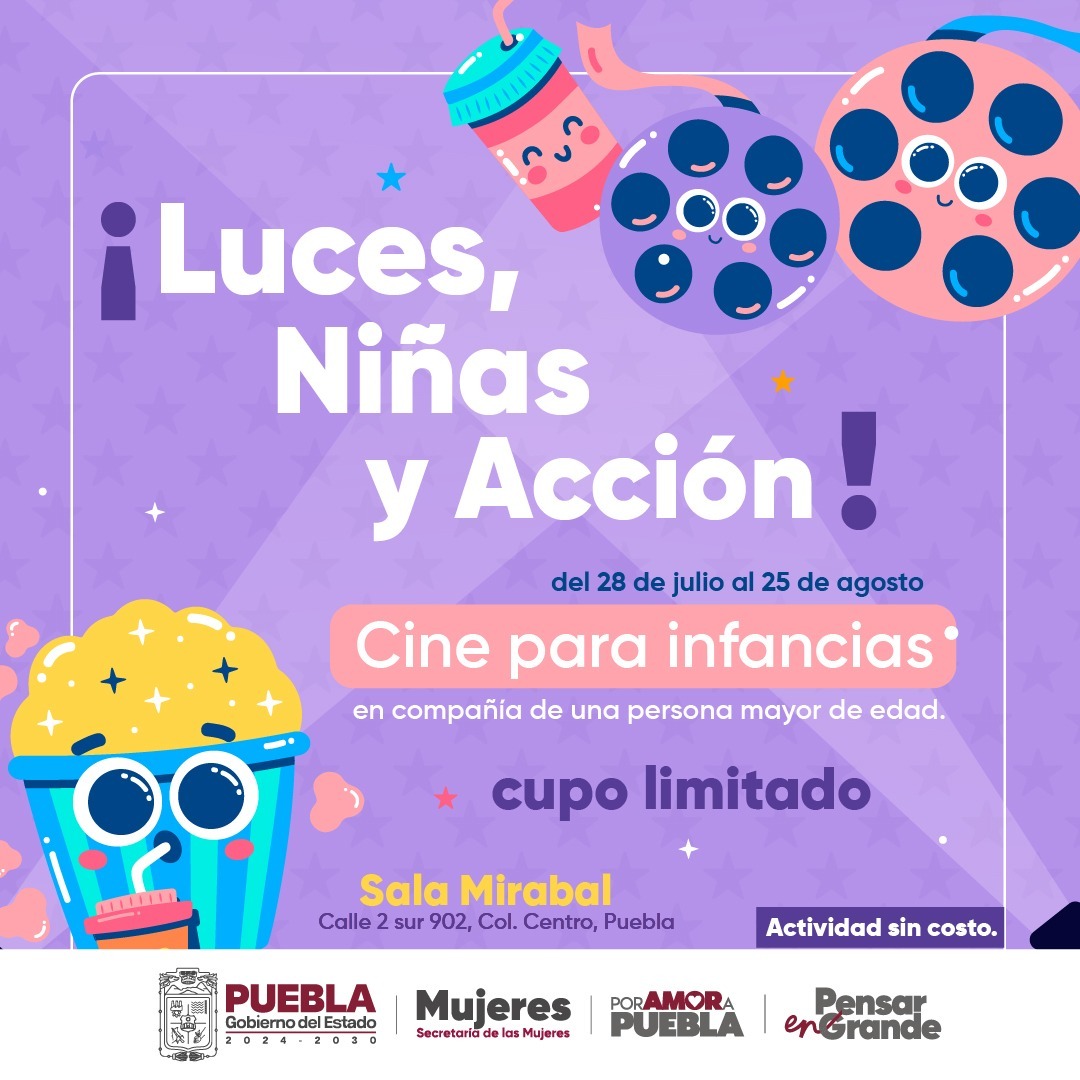 CIUDAD DE PUEBLA, Pue.- Con el objetivo de promover espacios culturales y recreativos que fortalezcan las redes de cuidado y promuevan la reconstrucción del tejido social, el Gobierno del Estado de Puebla, a través de la Secretaría de las Mujeres, invita a las infancias a disfrutar del ciclo de cine “¡Luces, niñas y acción!”.