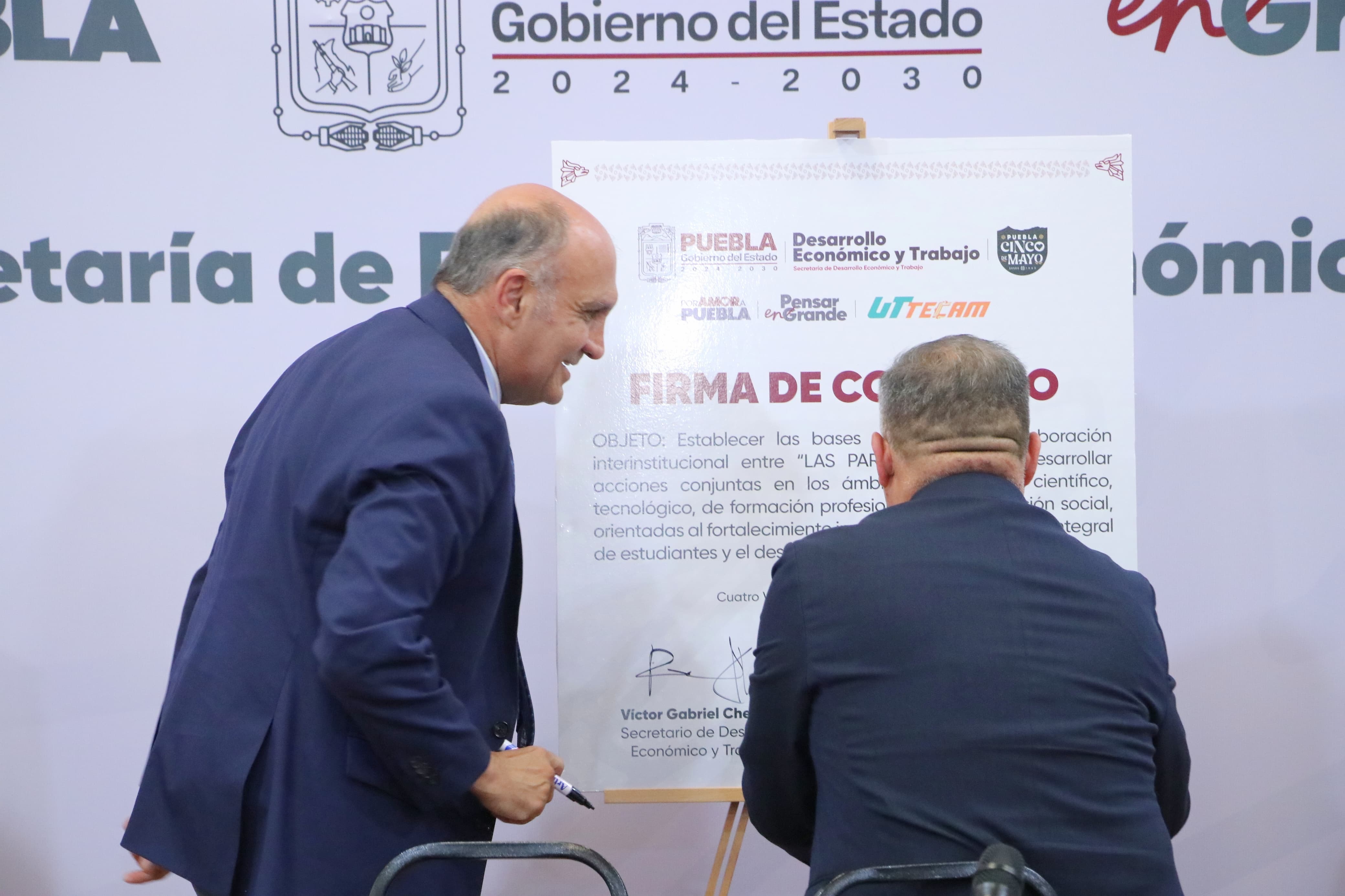 El secretario de Desarrollo Económico y Trabajo, Víctor Gabriel Chedraui, afirmó que el convenio firmado con la Universidad Tecnológica de Tecamachalco (UTTECAM) estableció una alianza estratégica para fortalecer las instituciones y contribuir al desarrollo sostenible de la región. Subrayó que, con este acuerdo, se beneficiarán directamente dos mil 800 estudiantes a través de acciones académicas, científicas, tecnológicas y de formación profesional, además de la implementación de estrategias de incubación, aceleración y acompañamiento a emprendedores.