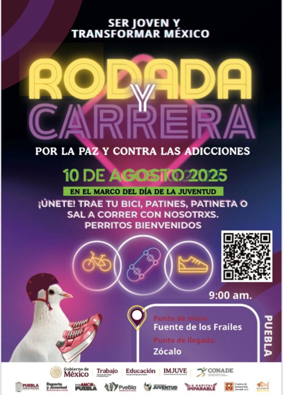 CIUDAD DE PUEBLA, Pue.- Como parte de las actividades con motivo del mes de las y los jóvenes, el Instituto Mexicano de la Juventud (IMJUVE) en conjunto con el Gobierno del Estado y del municipio, invitan al público en general a participar en la caminata y rodada “Por la Paz contra las Adicciones”, actividad que se realizará este domingo 10 de agosto a partir de las 9:00 horas.
