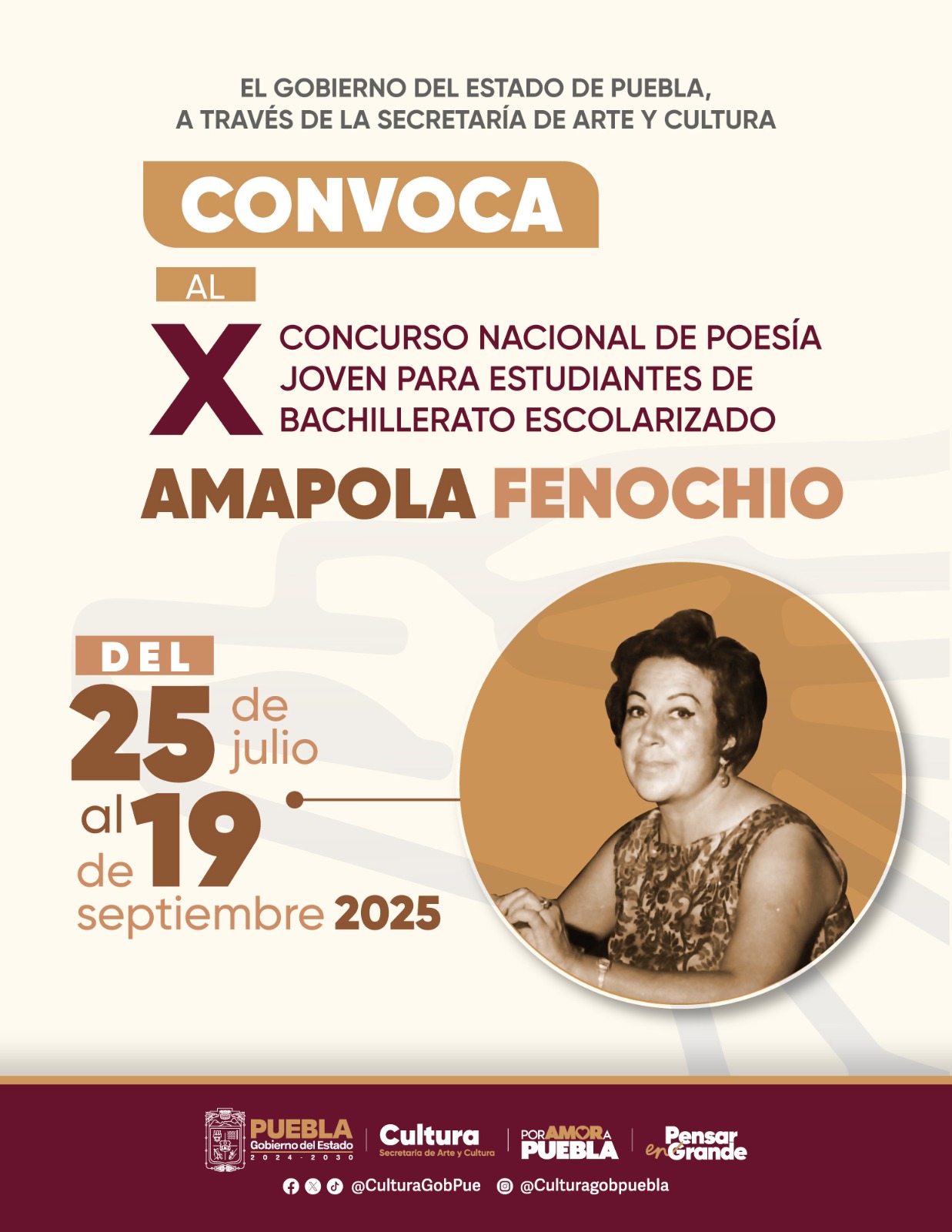 Igualmente, la dependencia convoca al Concurso Nacional de Poesía “Germán List Arzubide”, en el que mayores de edad deberán presentar un poemario en español de entre 30 y 80 páginas. Asimismo, se invita a ser parte del Concurso Nacional de Poesía Joven para Estudiantes de Bachillerato “Amapola Fenochio”, para obras de entre 10 y 15 cuartillas hechas por jóvenes de entre 15 y 19 años. El primero contempla un premio único de 24 mil pesos, mientras que en el segundo recibirán 12 mil, 7 mil 200 y 4 mil 800 los tres primeros lugares.