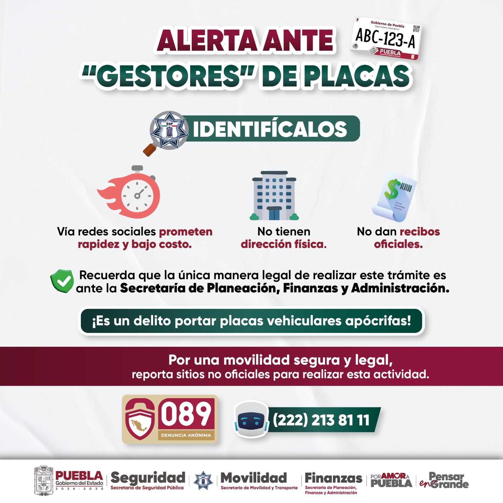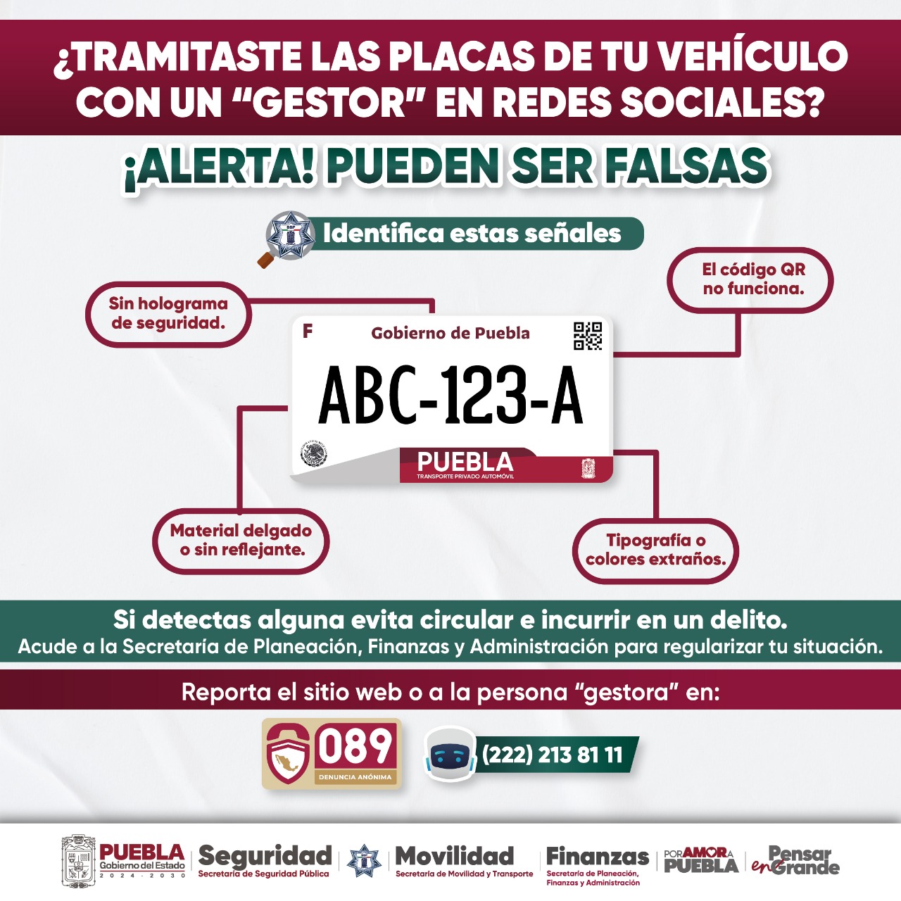 CIUDAD DE PUEBLA, Pue.- El Gobierno del Estado de Puebla, a través de la Secretaría de Seguridad Pública (SSP), alerta a la ciudadanía sobre los riesgos de tramitar placas de circulación mediante redes sociales con “gestores o coyotes”.