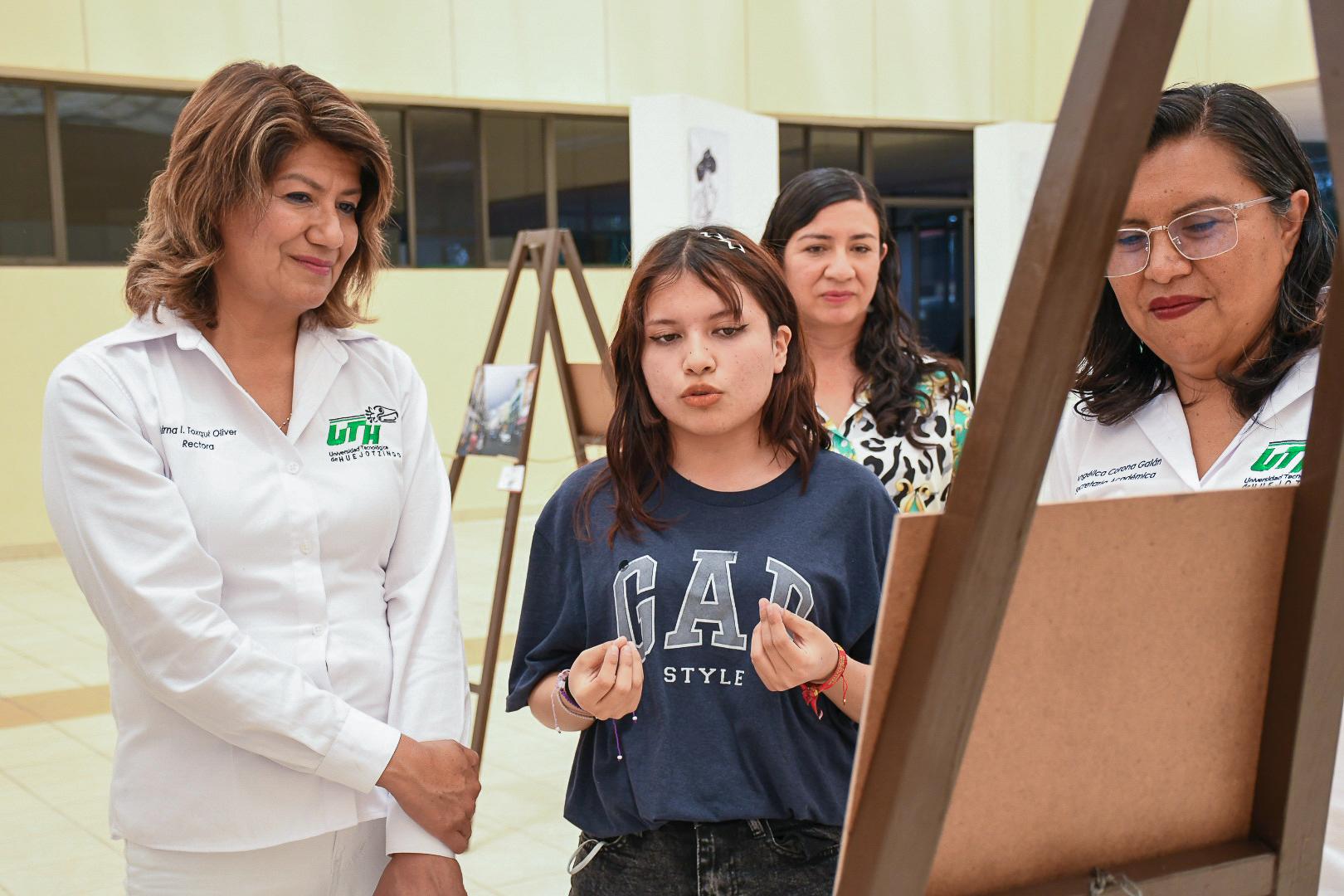 La rectora de la UTH, Mirna Toxqui Oliver, reconoció el talento de las y los alumnos que plasmaron sus ideas mediante diferentes obras que expusieron en las instalaciones de la institución.