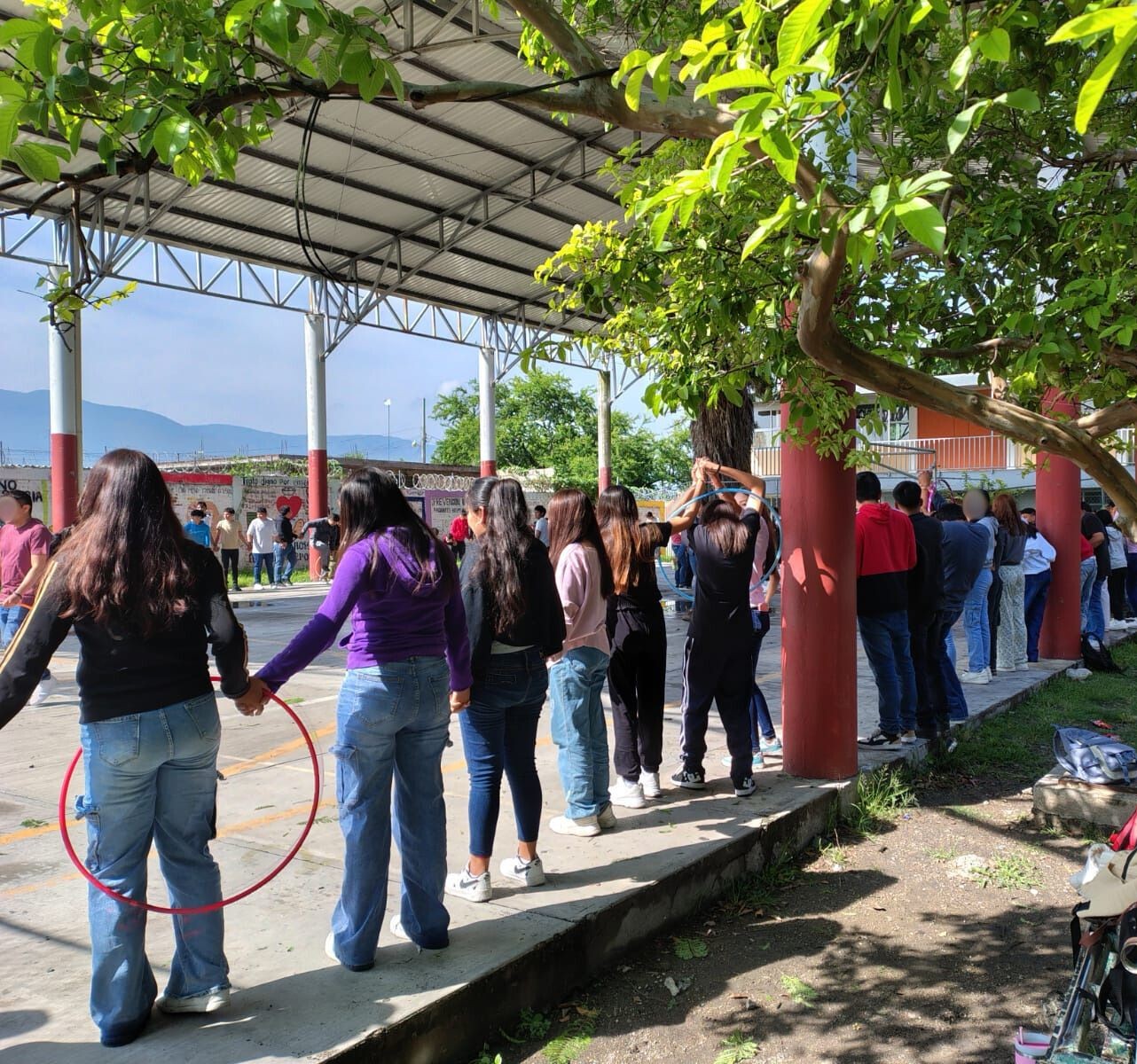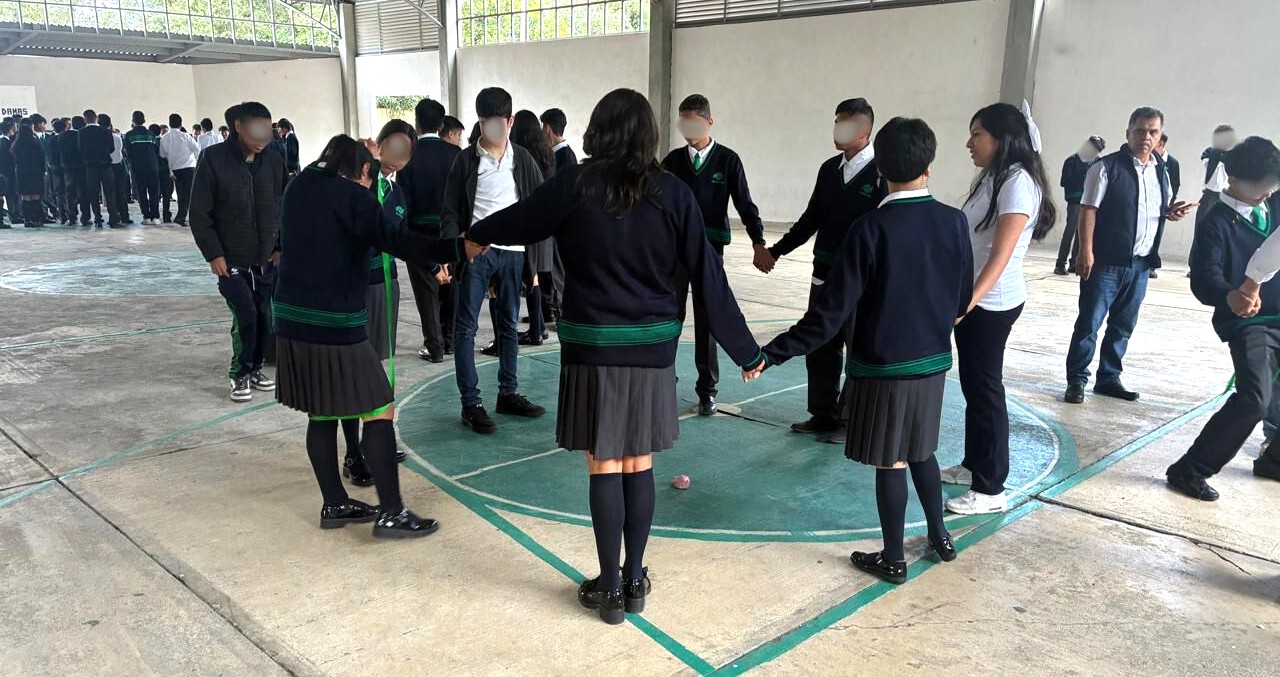 •“Pase de listón” (práctica a través de la cual las y los estudiantes forman grupos y tomados de las manos transfieren a su compañero de junto un listón sin soltarse).