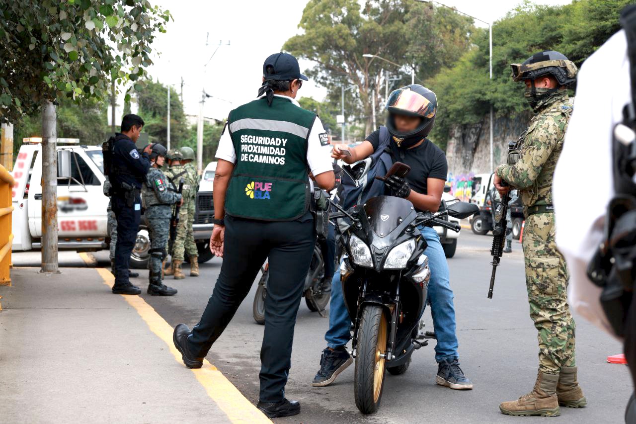 CIUDAD DE PUEBLA, Pue.- Con el objetivo de inhibir la comisión de delitos a bordo de motocicletas y garantizar el cumplimiento de la normativa vial, la Secretaría de Seguridad Pública (SSP), en coordinación con autoridades federales y municipales, implementó el “Operativo ROMA” sobre el Bulevar Carlos Camacho Espíritu, a la altura de San Francisco Totimehuacan.