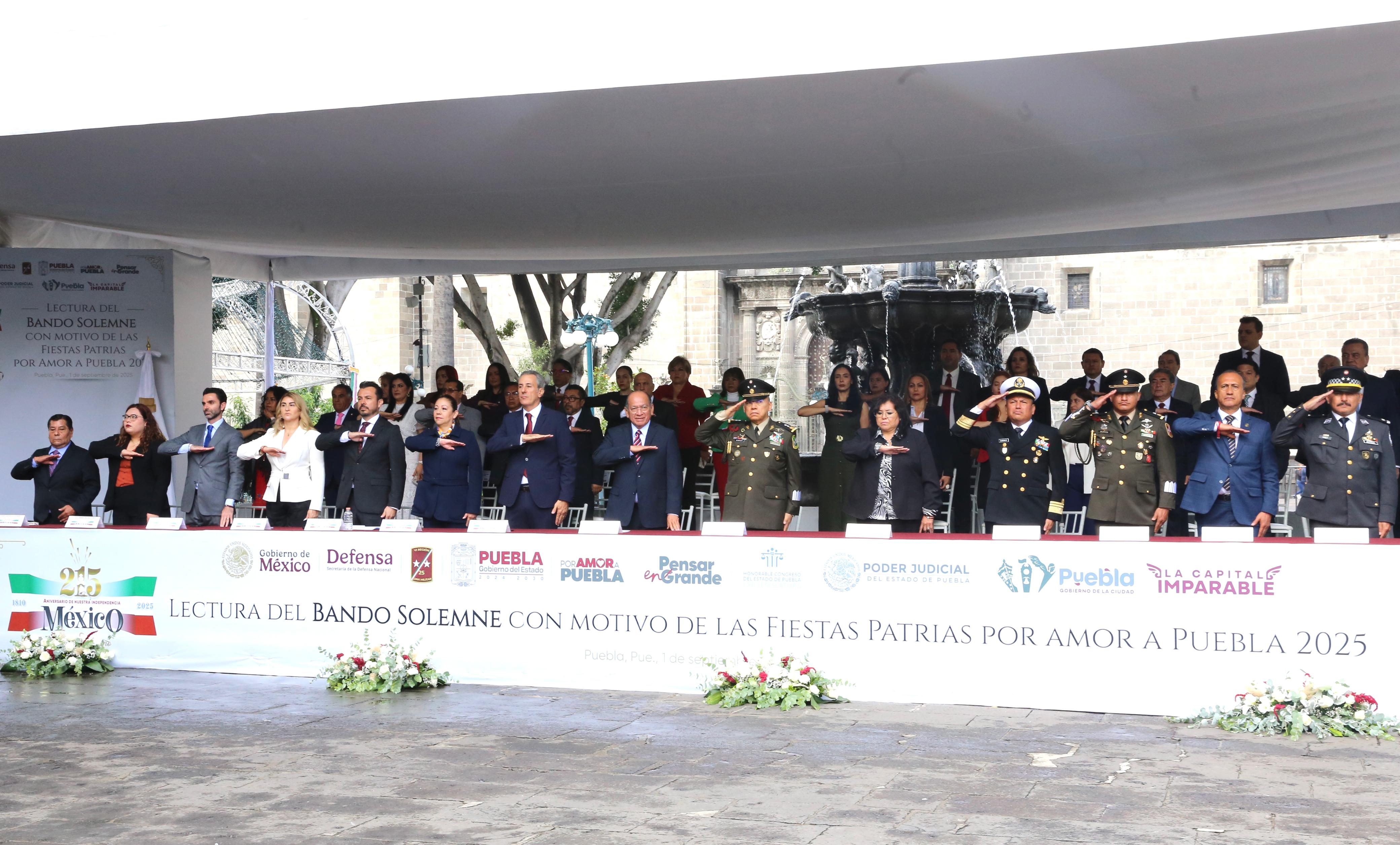 CIUDAD DE PUEBLA, Pue.- En representación del gobernador Alejandro Armenta, el secretario de Gobernación, Samuel Aguilar Pala, encabezó la ceremonia de lectura del Bando Solemne, con lo que marca el comienzo de las actividades cívicas y culturales del mes patrio, así como la conmemoración del 215 Aniversario del Inicio de la Independencia de México.