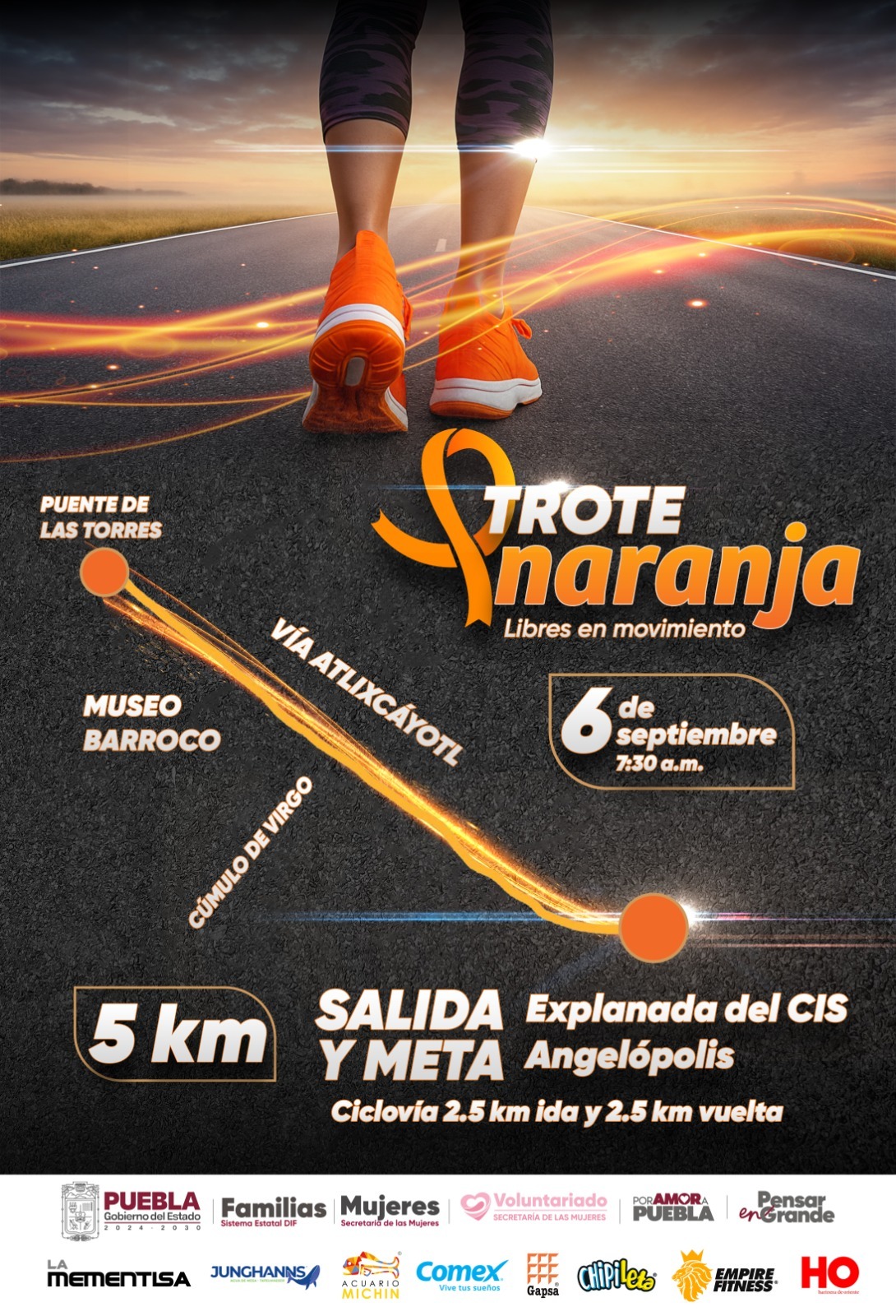 CIUDAD DE PUEBLA, Pue.- Con el objetivo de fortalecer los vínculos solidarios y promover la construcción de entornos seguros, el Gobierno del Estado de Puebla, a través de la Secretaría de las Mujeres y su Voluntariado, convoca a la ciudadanía a participar en la carrera “Trote Naranja: Libres en Movimiento”, que se llevará a cabo el próximo sábado 6 de septiembre de 2025, a partir de las 7:30 horas, con punto de salida en la Explanada del Centro Integral de Servicios (CIS) Angelópolis.