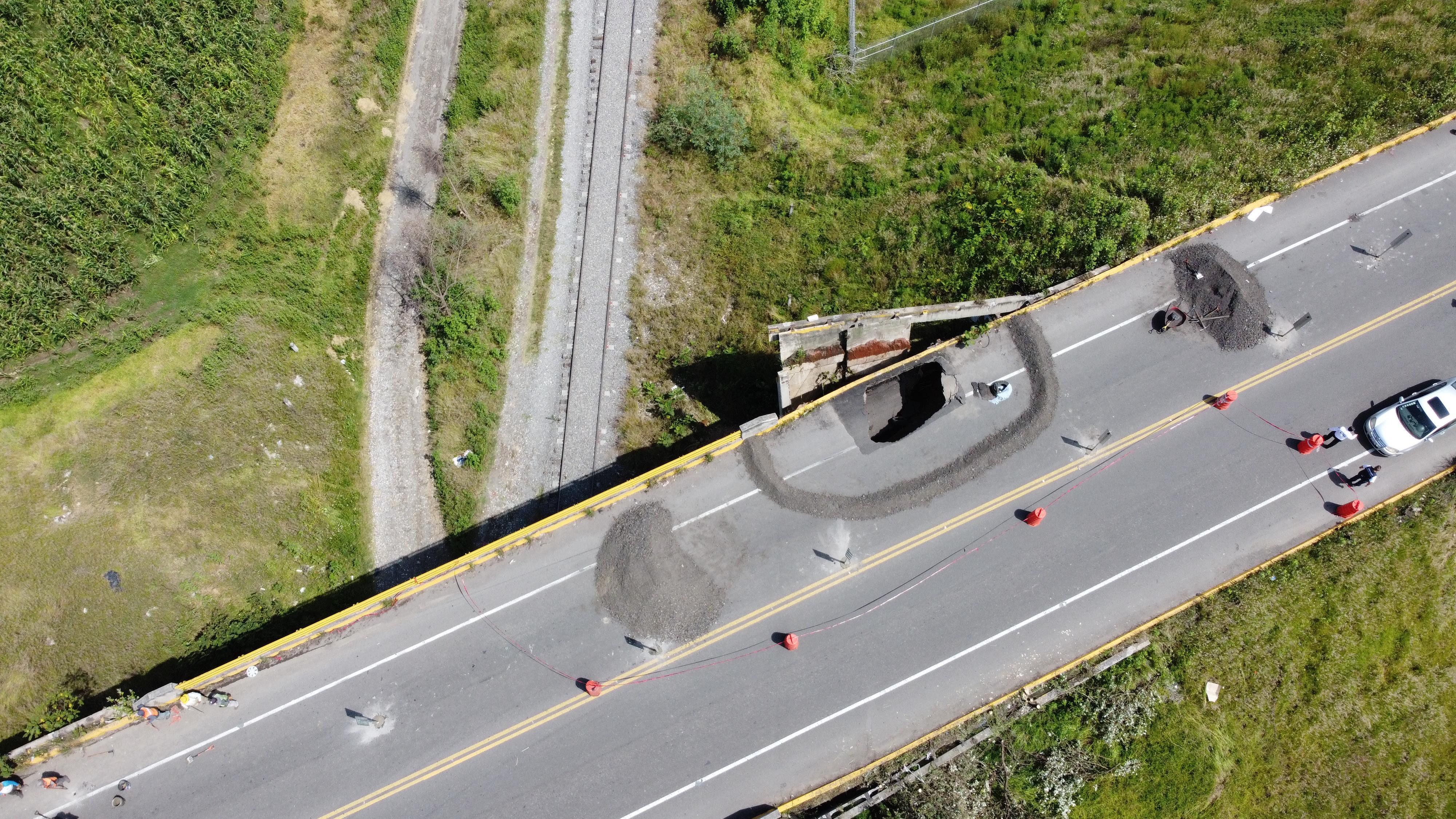 Este socavón es de 3 metros de ancho, 8 metros de largo y 5 metros de profundidad, localizado en la parte final de la rampa de acceso. El daño fue provocado por el desprendimiento de las tabletas laterales que conforman la estructura de contención en dicho punto.