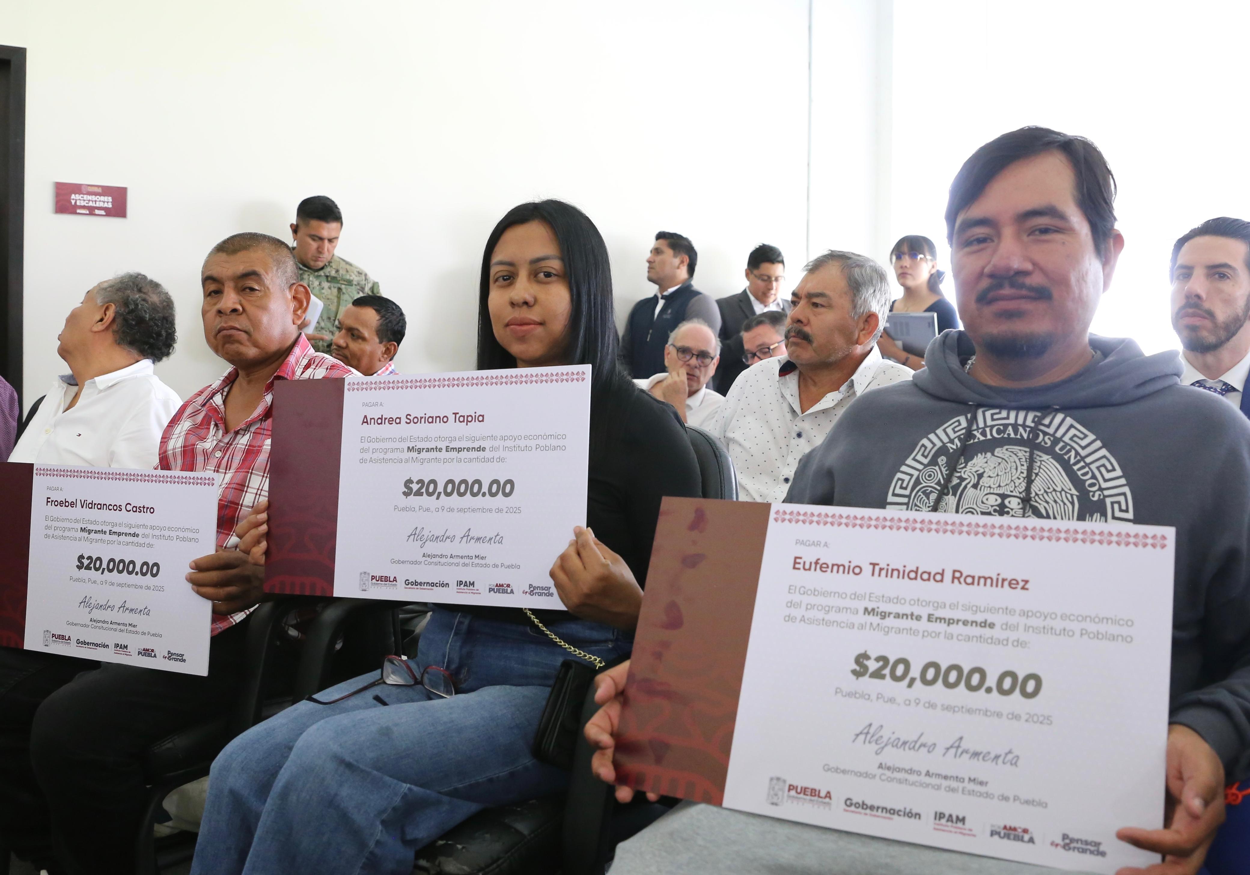 Durante este acto se realizó la entrega simbólica a tres beneficiarios del programa Migrante Emprende: Froebel Vidrancos Castro del municipio de Chiautla, para una tienda de abarrotes; Andrea Soriano Tapia del municipio de Puebla, para el establecimiento de una estética; Eufemio Trinidad Ramírez del municipio de Atlixco, para la adquisición de insumos para el campo.