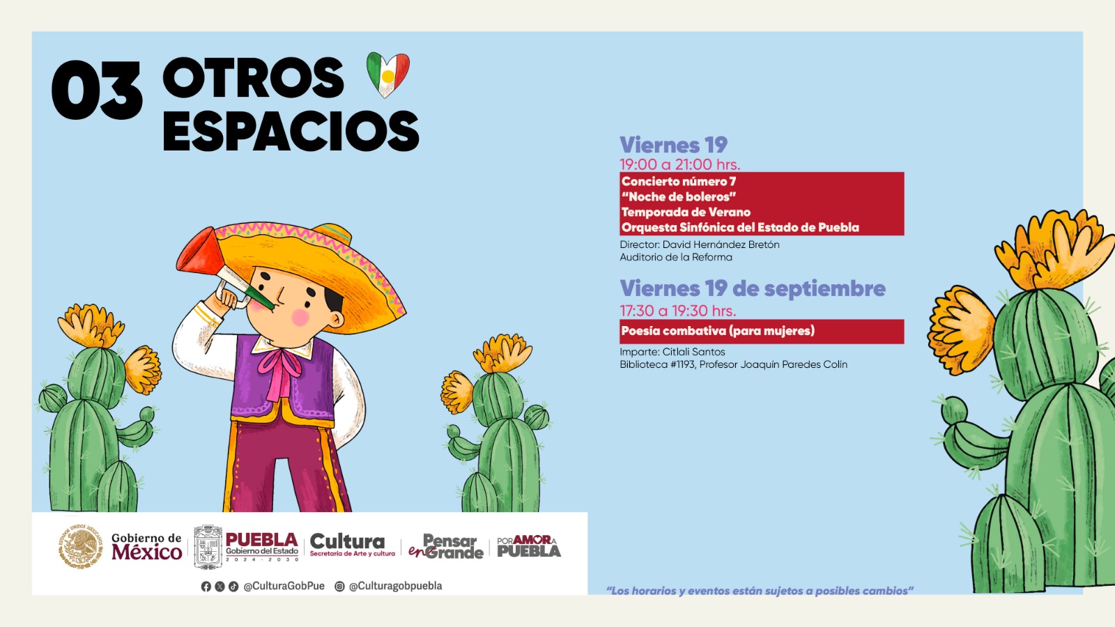 - La Orquesta Sinfónica del Estado de Puebla presentará una Noche de Boleros en el Auditorio de la Reforma, mientras que la Banda Sinfónica del CECAMBA desarrollará el repertorio “Fiesta Mexicana” en la Casa de la Cultura.