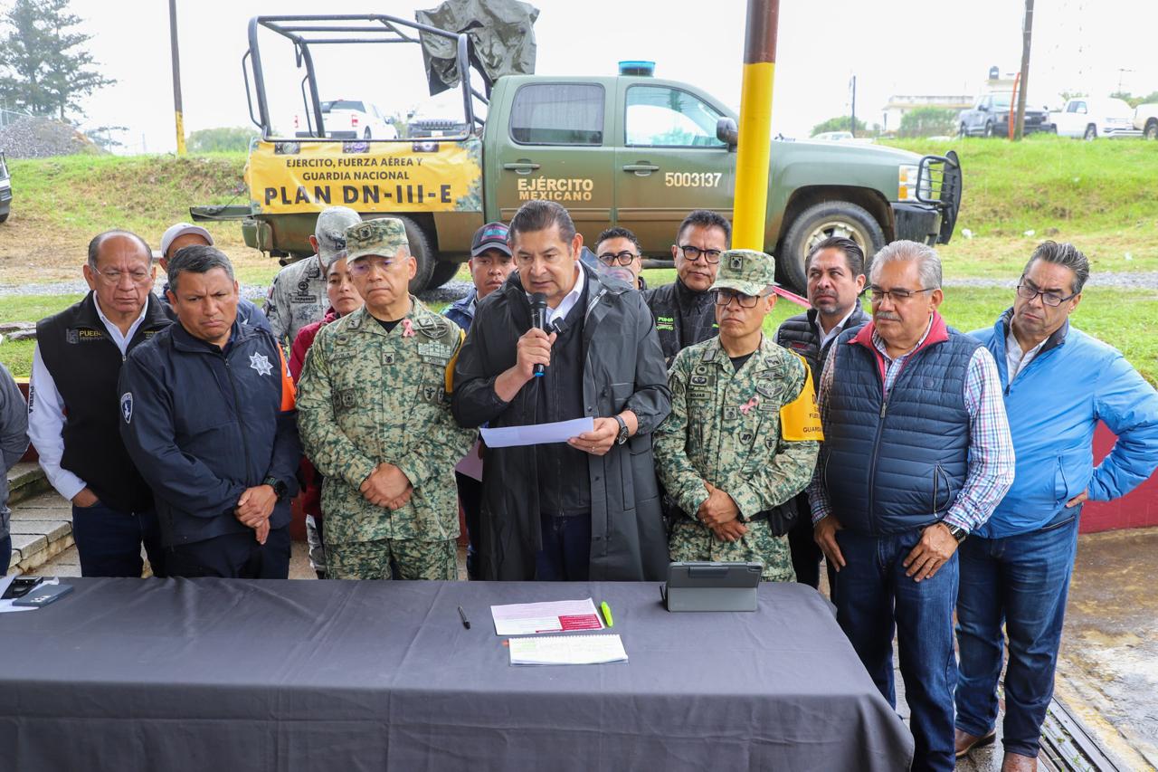 Acompañado por el Comandante de la VI Región Militar, Héctor Ávila Alcocer; el General Comandante interino de la XXV Zona Militar, Francisco Antonio Enríquez Rojas, integrantes del gabinete estatal y autoridades municipales, el Gobernador detalló que se tienen cinco equipos para responder a la emergencia, distribuidos en los municipios de Huauchinango, Xicotepec, Tlacuilotepec, Jalpan y Zihuateutla.