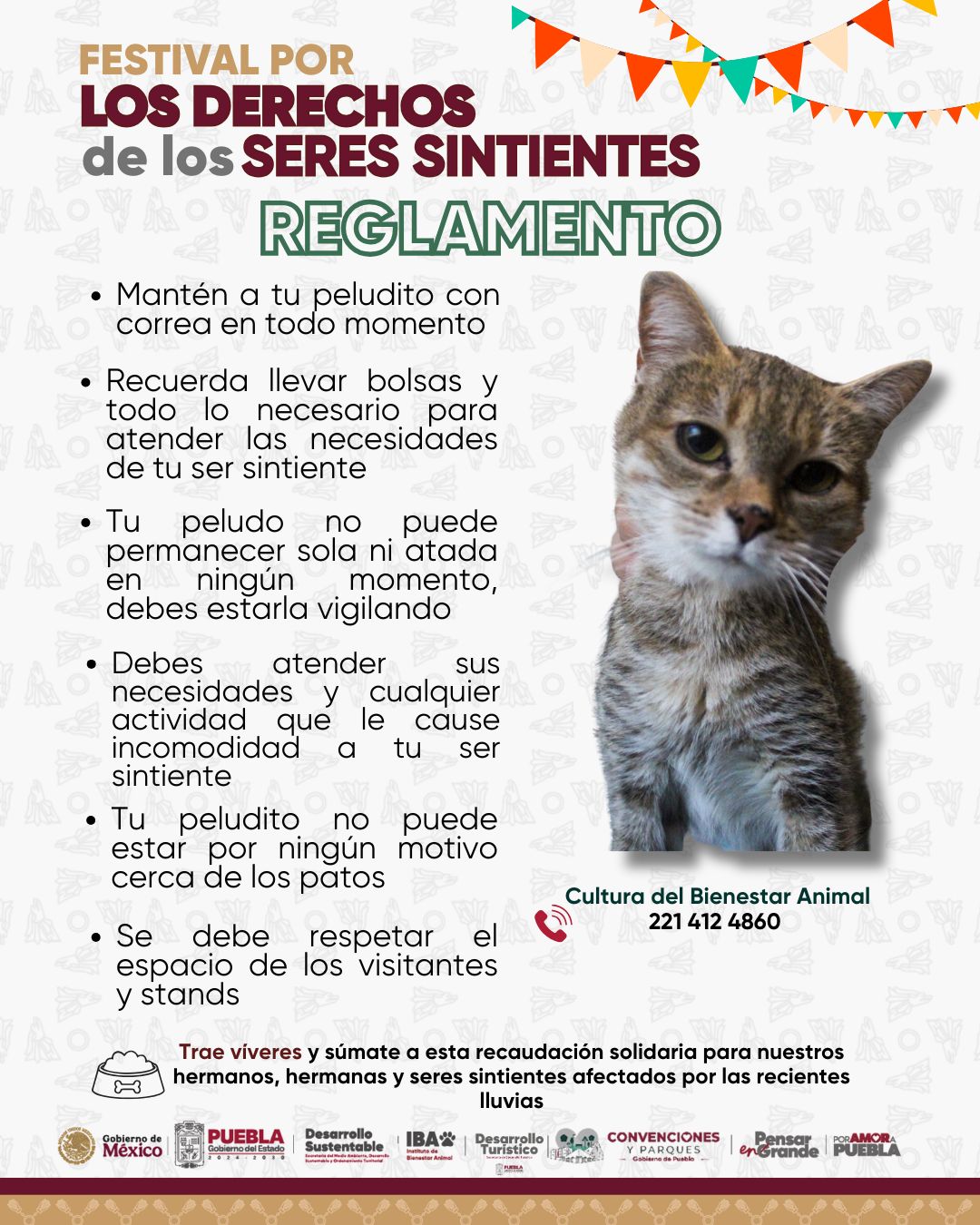 Por segunda ocasión, el Parque Ecológico se declara espacio amigable con los seres sintientes, lo que refleja el compromiso del Gobierno de Puebla con un entorno armónico, seguro y respetuoso. Se recuerda a quienes asistan con su acompañante peludo que deben consultar el reglamento del festival, el cual establece el uso obligatorio de correa, la atención constante a las necesidades del ser sintiente y el respeto a los espacios compartidos y a la fauna del lugar.