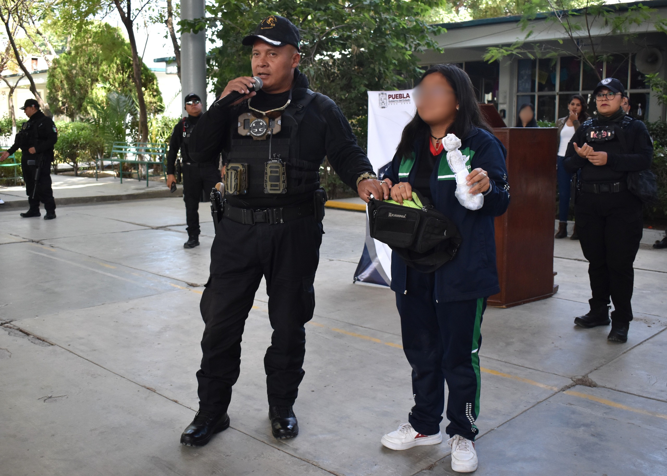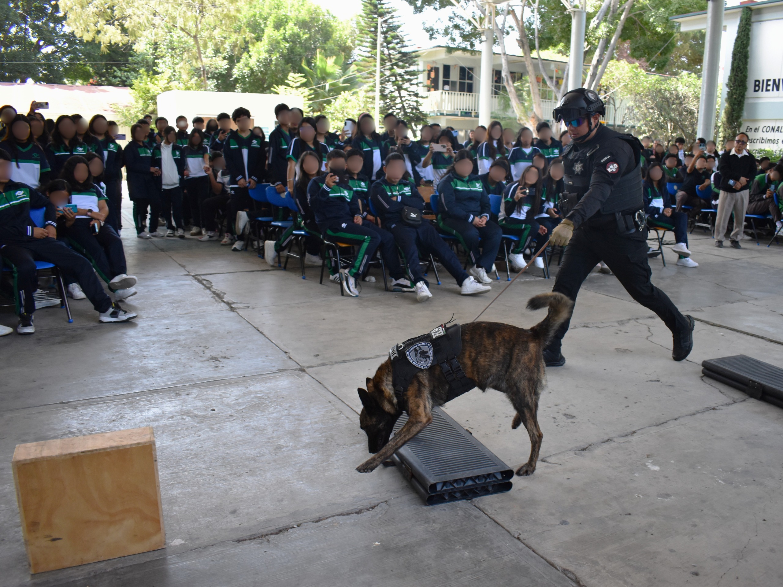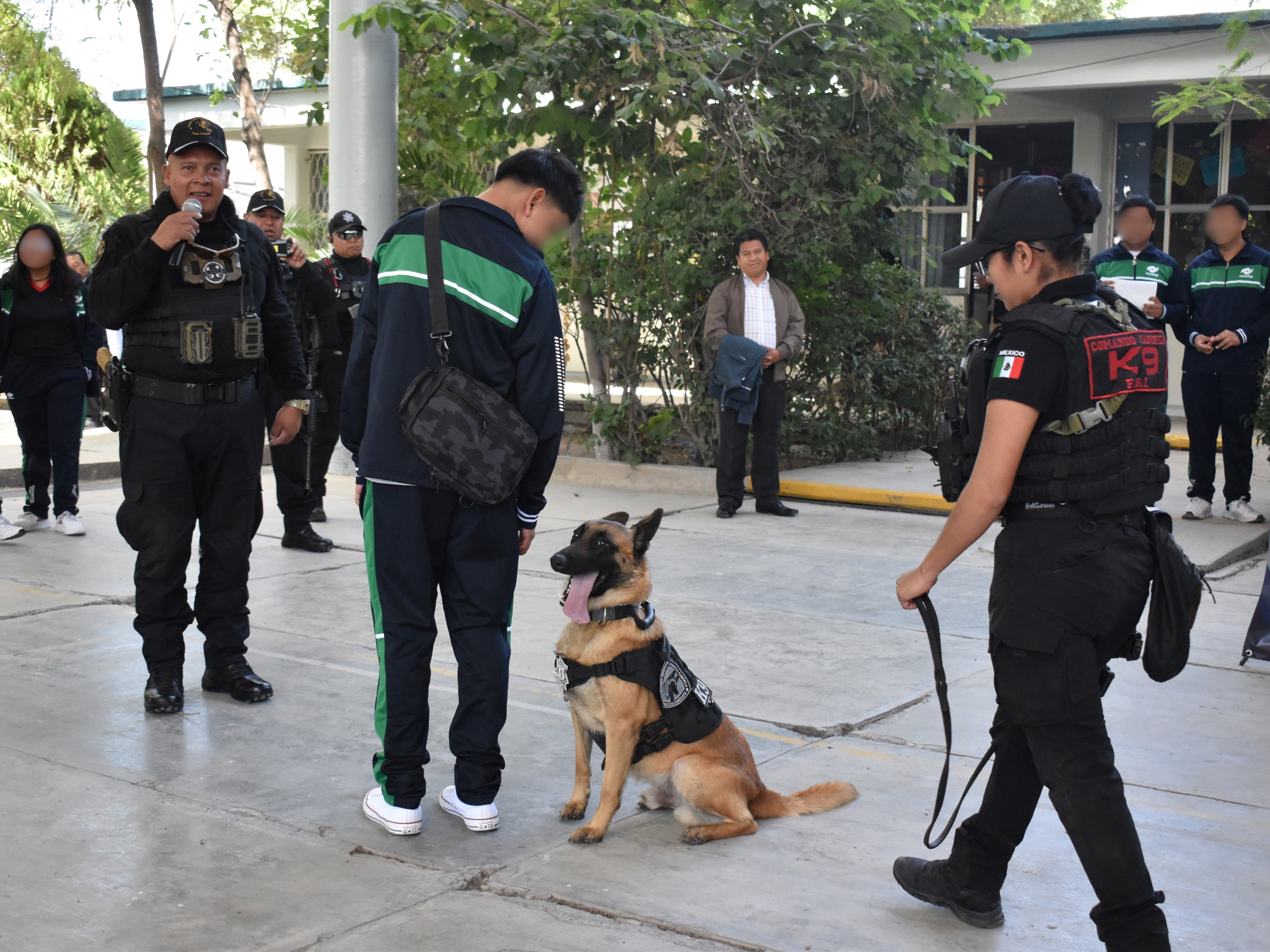 Finalmente, el Escuadrón Canófilo K9 de la SSP, a cargo de Arturo Galván Castañeda, efectuó una demostración de rastreo y localización de estupefacientes con dos binomios caninos.