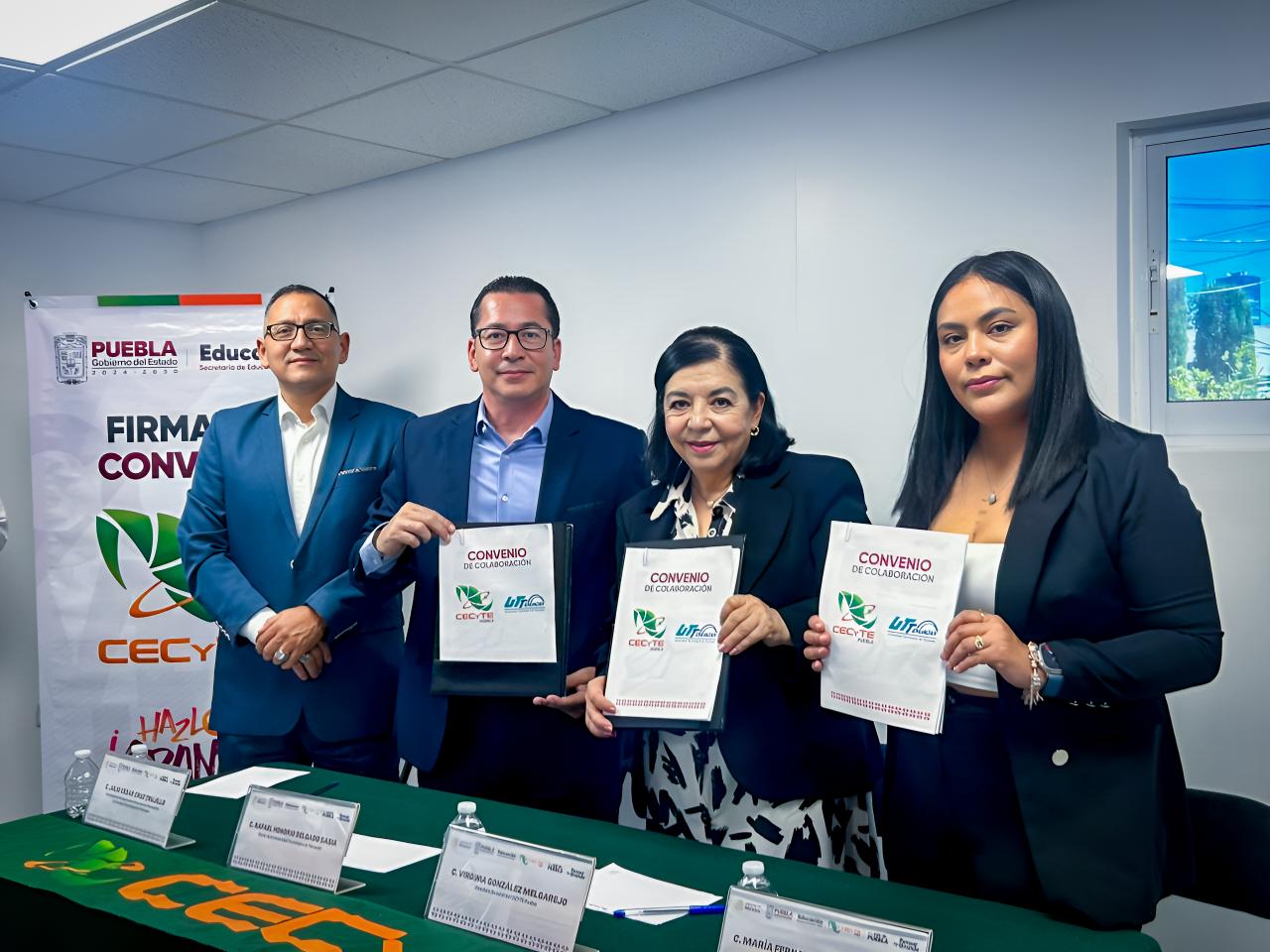 CIUDAD DE PUEBLA, Pue. - La Universidad Tecnológica de Tehuacán (UTTehuacán) y el Colegio de Estudios Científicos y Tecnológicos del Estado de Puebla (CECyTE Puebla) llevaron a cabo la firma de un convenio de colaboración con el propósito de fortalecer el trabajo conjunto en materia académica, de investigación y vinculación.