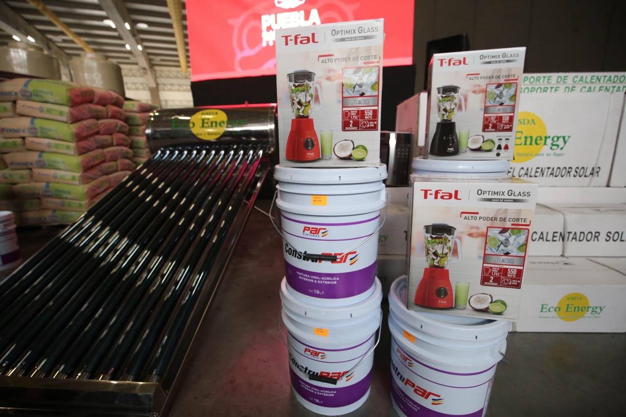 Señaló que 11 mil 572 beneficiarios recibirán alguno de los tres paquetes entregados: el primer paquete incluye un tinaco de mil 200 litros, 10 bultos de cemento y 30 varillas de 3/8; el segundo, un calentador solar de 12 tubos, un microondas de 40 litros y una licuadora con vaso de vidrio; y el tercero, un refrigerador, dos botes de pintura blanca y un microondas de 20 litros.