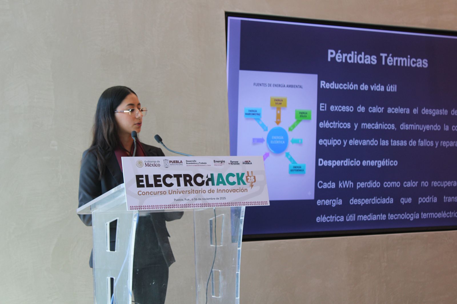 En su intervención, el subgerente de Servicios del Mercado Eléctrico Mayorista de la Gerencia de Control Regional Oriental del CENACE (Centro Nacional de Control de Energía), Moisés Salazar Espino, celebró la unión de ideas, talentos y compromisos de los participantes. "La verdadera energía que mueve al mundo no es la energía eléctrica sino la energía de la juventud por colaborar y construir un futuro más sostenible", sostuvo