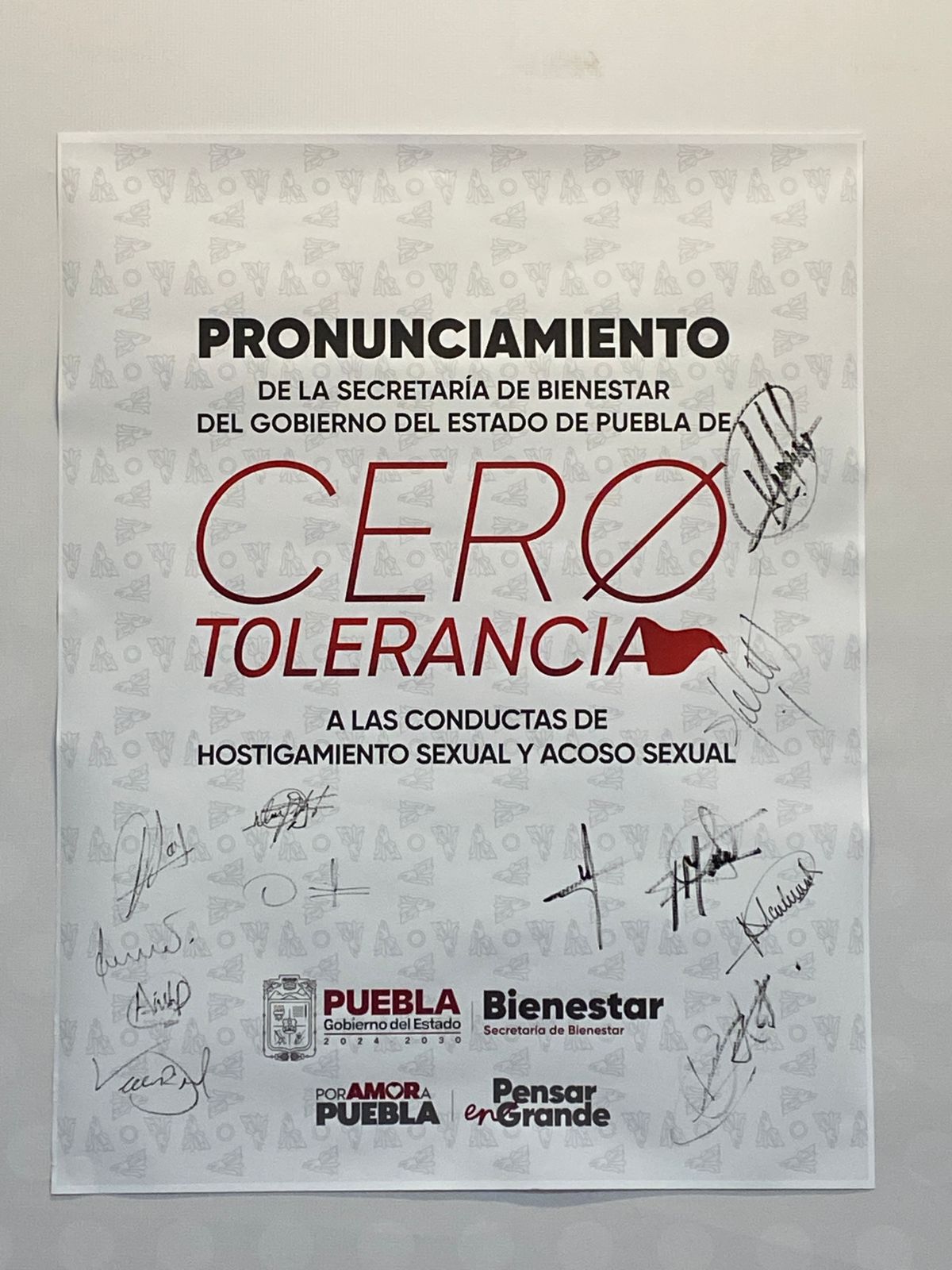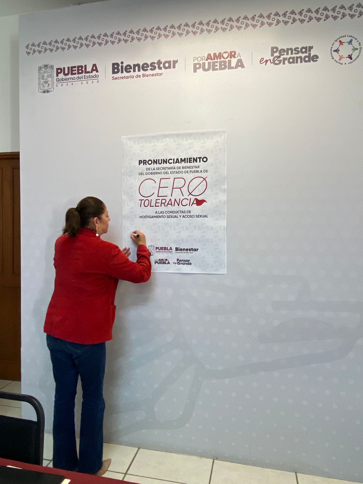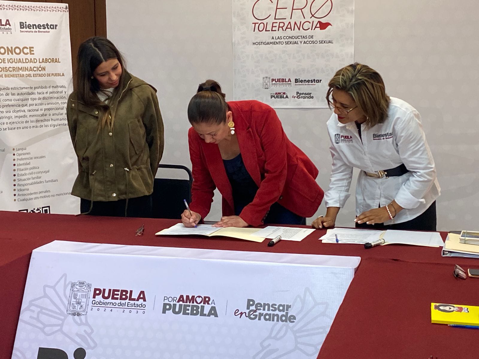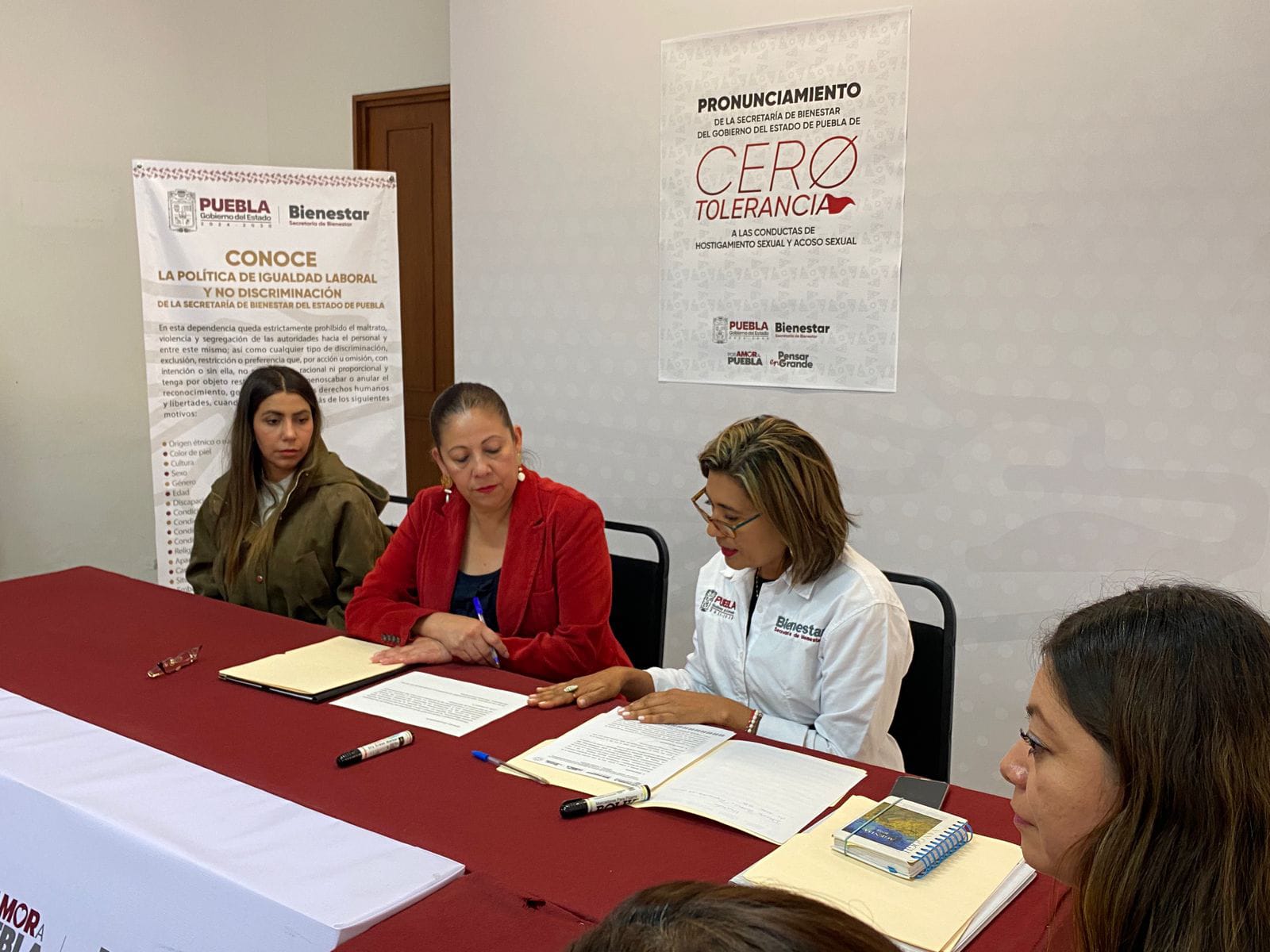 CIUDAD DE PUEBLA, Pue.– En congruencia con la política de respeto, igualdad y justicia impulsada por la presidenta de México, Claudia Sheinbaum y el gobernador Alejandro Armenta, la secretaria de Bienestar, Laura Artemisa García Chávez, firmó el Pronunciamiento de Cero Tolerancia a las Conductas de Hostigamiento Sexual, Acoso Sexual, Violencia o cualquier acto que atente contra la dignidad e integridad de las personas. Este manifiesto también fue signado por las y los integrantes del Comité de Ética y Prevención de Conflictos de Interés.