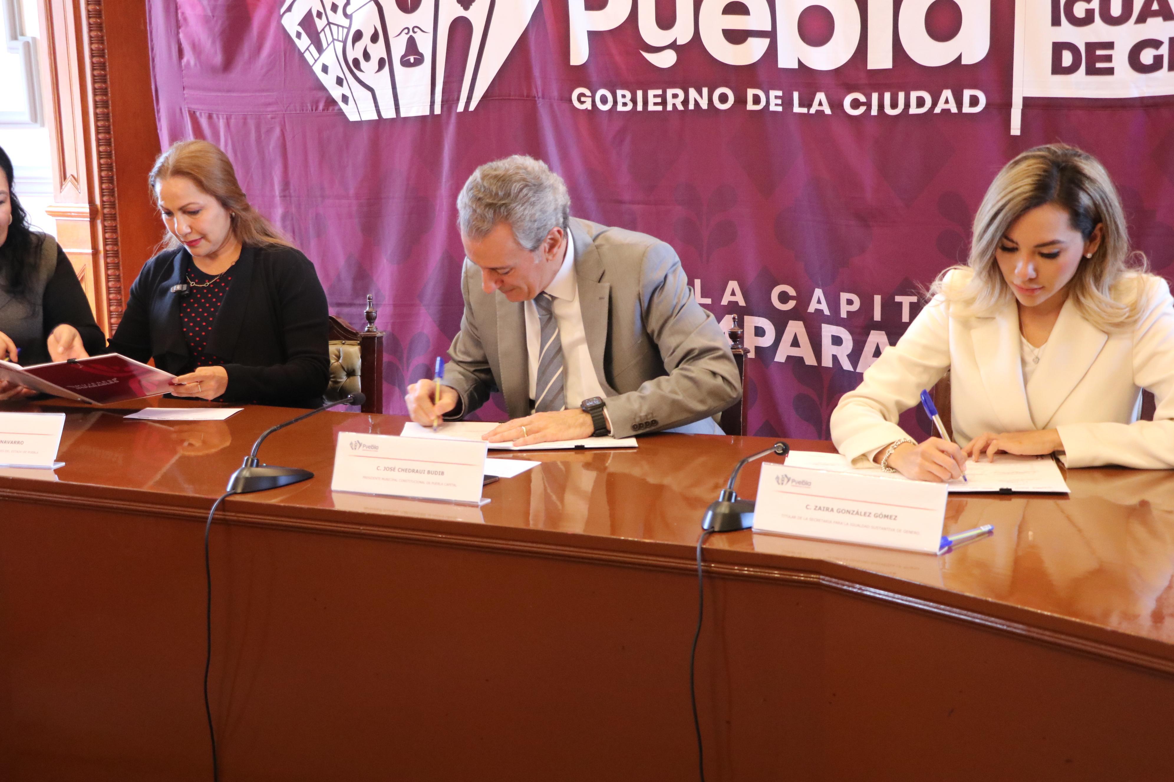 Esta firma contó con la participación del presidente municipal de Puebla, José Chedraui Budib; la titular de la Secretaría para la Igualdad Sustantiva de Género, Zaira González Gómez; y los presidentes de las juntas auxiliares de Santo Tomás Chautla y de San Sebastián Aparicio, Rafael Merino Morales y Gregorio Aparicio Guadalupe, respectivamente.