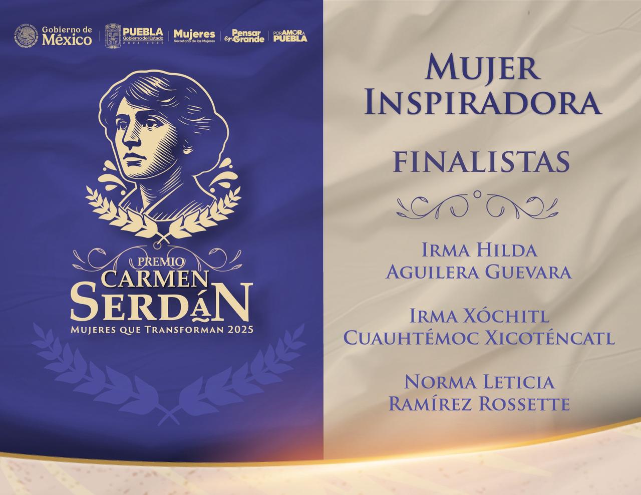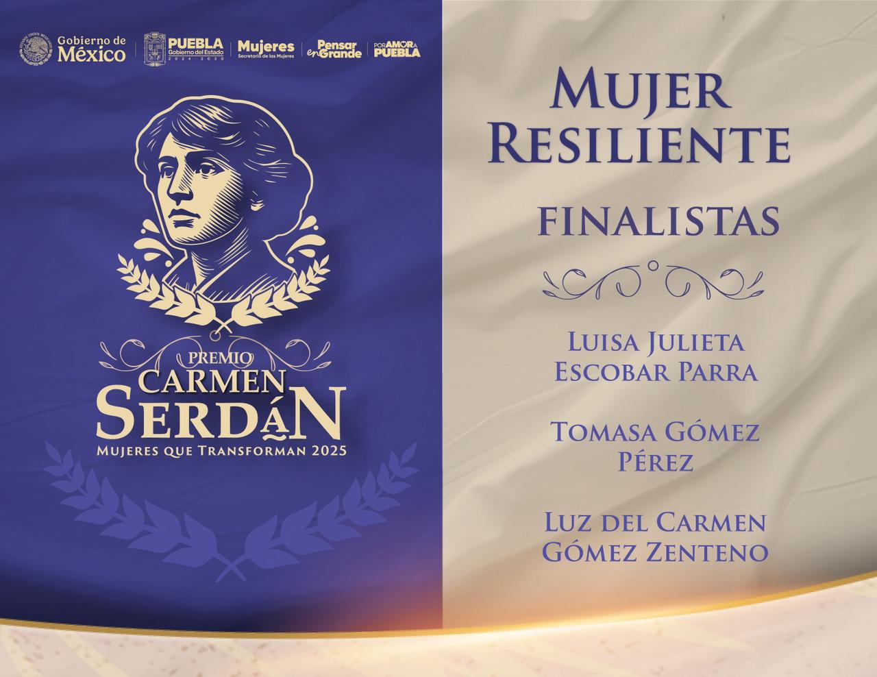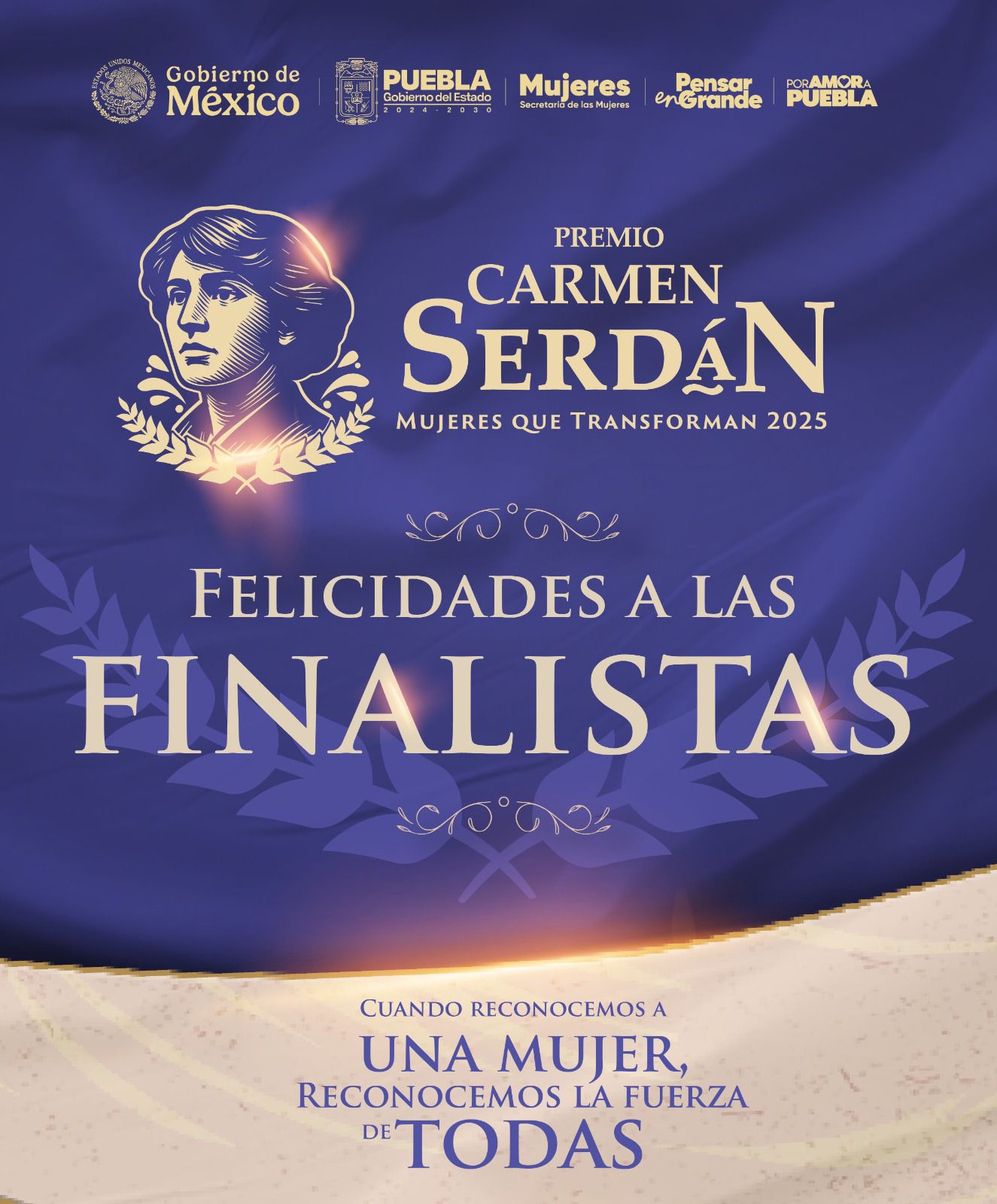 CIUDAD DE PUEBLA, Pue.- El Gobierno del Estado de Puebla, a través de la Secretaría de las Mujeres, da a conocer a las finalistas del Premio Carmen Serdán “Mujeres que Transforman” 2025, un reconocimiento que visibiliza la fuerza, el liderazgo y la contribución de mujeres que impulsan el desarrollo social, comunitario y profesional en la entidad.