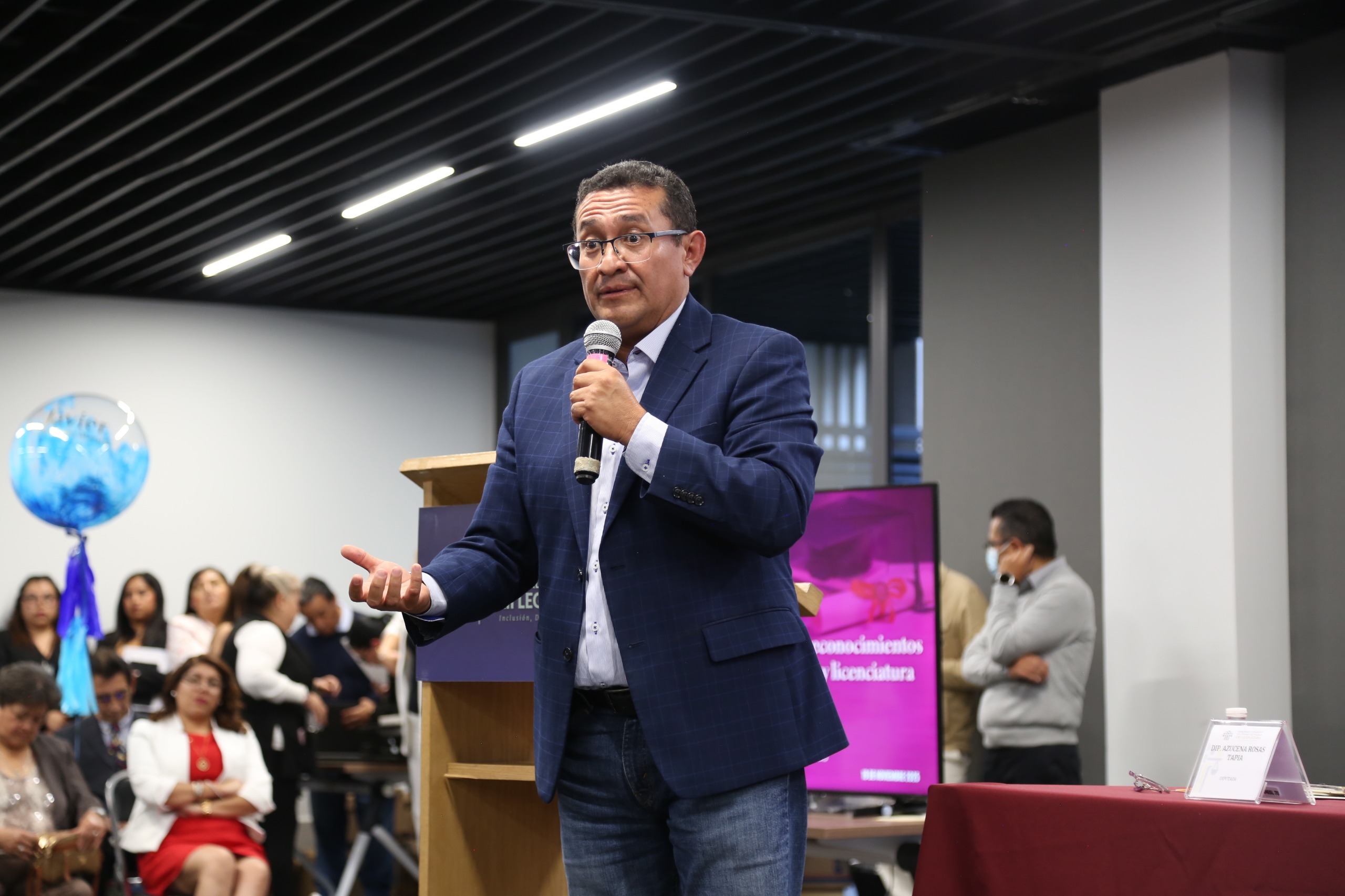 En representación del gobernador Alejandro Armenta, asistió el director de Profesiones de la Secretaría de Educación Pública, José Raúl Garzón Toledano, quien dirigió un mensaje de felicitación a las y los profesionistas por su esfuerzo y dedicación.