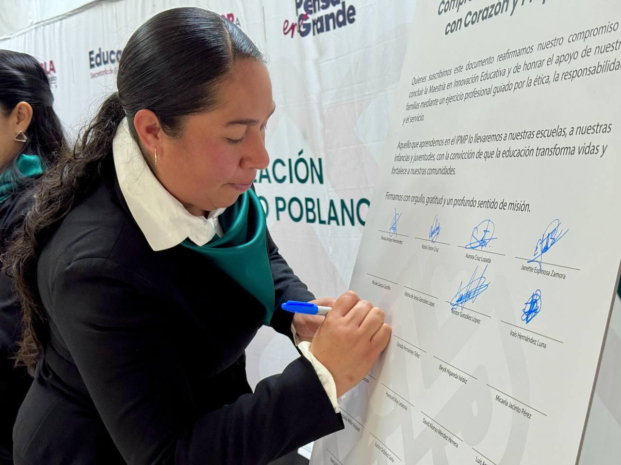 ZACATLÁN, Pue.— Con el propósito de reafirmar la responsabilidad de las y los docentes para culminar su posgrado, el Instituto de Profesionalización del Magisterio Poblano (IPMP) desarrolló la ceremonia “Compromiso por la Educación con Corazón y Propósito”. La actividad reunió a veinticuatro estudiantes de la maestría en Innovación Educativa, quienes participaron junto con sus familias.