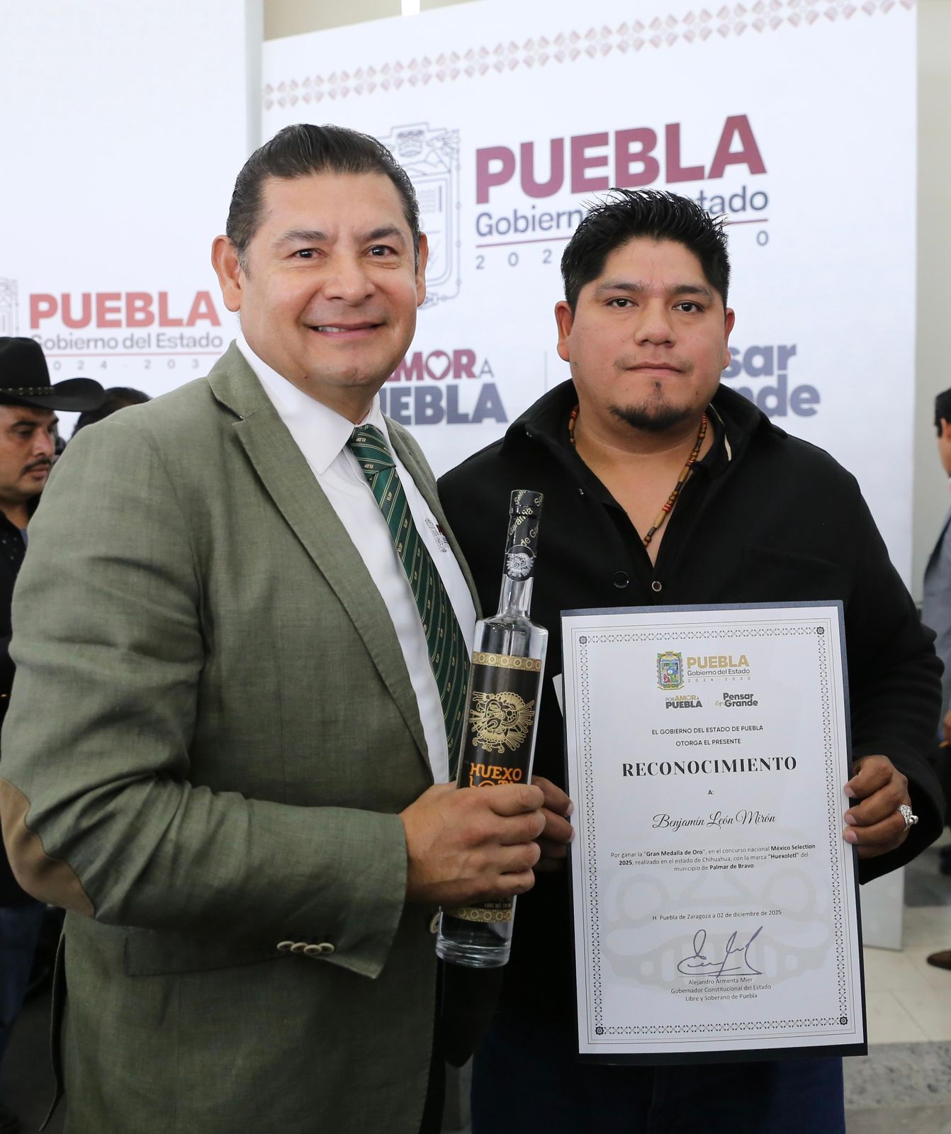 CIUDAD DE PUEBLA, Puebla.- Al entregar reconocimientos a las y los 35 maestros mezcaleros que triunfaron en el Concurso Nacional México Selection 2025, el gobernador Alejandro Armenta subrayó que las y los productores son un orgullo para las y los poblanos, ya que son “mezcaleros de alto rendimiento”, pues son producto del amor al agave.
