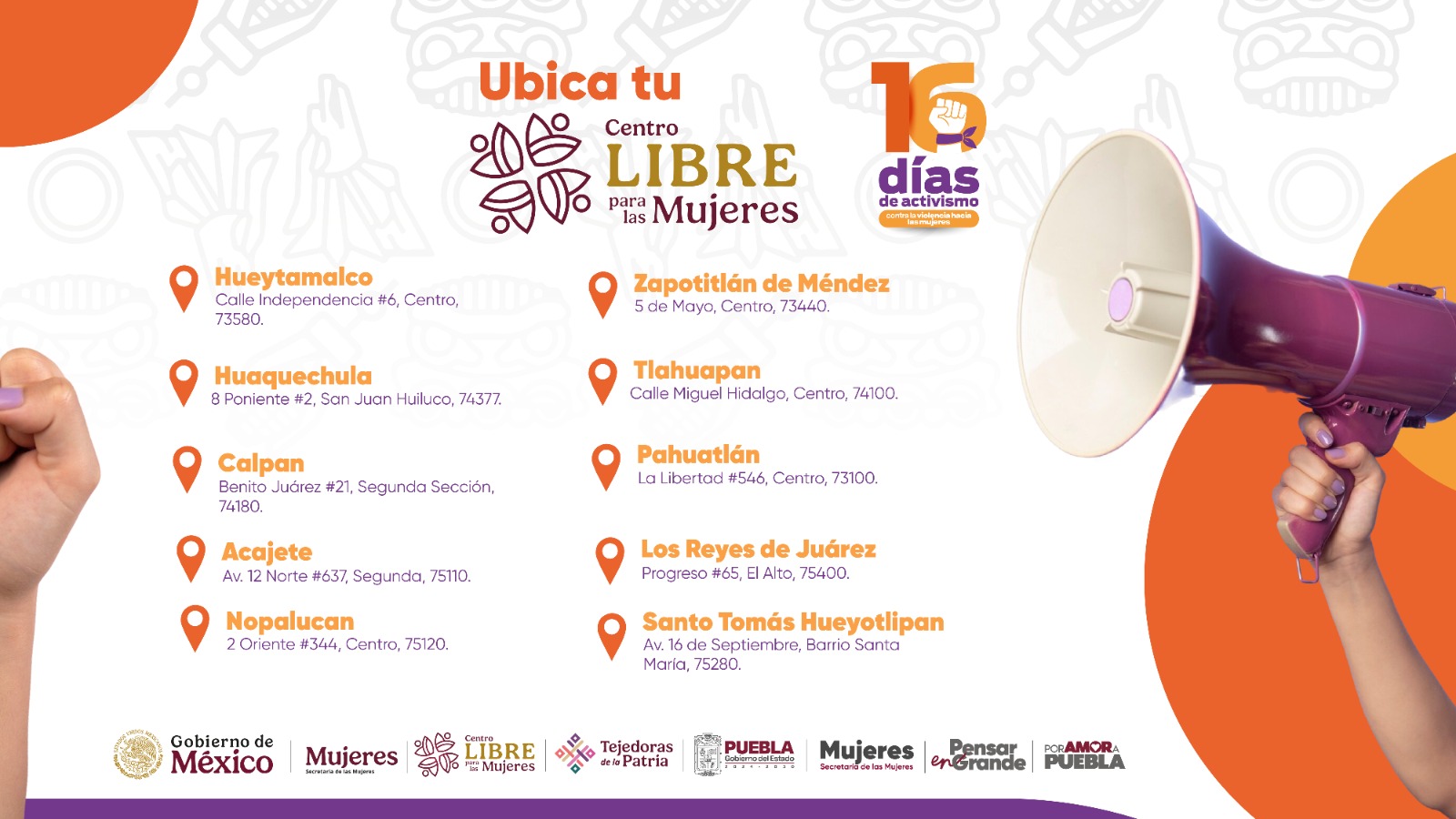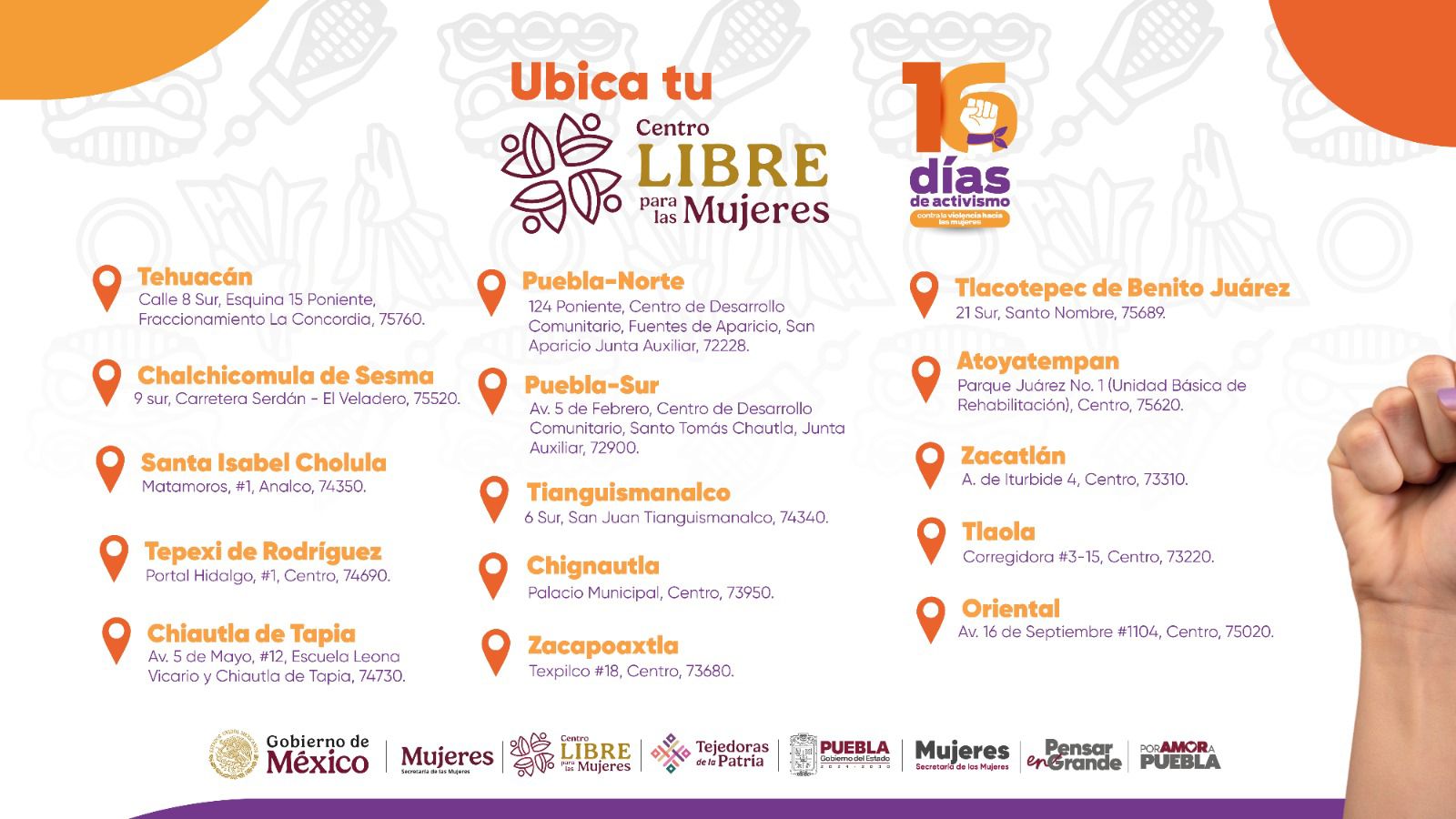 El Gobierno del Estado de Puebla invita a las mujeres a identificar su Centro LIBRE–Casa Carmen Serdán más cercano en los siguientes municipios: Acajete, Atoyatempan, Calpan, Chalchicomula de Sesma, Chiautla de Tapia, Chignautla, Huaquechula, Hueytamalco, Los Reyes de Juárez, Nopalucan, Oriental, Pahuatlán, San Aparicio (Puebla), Santa Isabel Cholula, Santo Tomás Chiautla (Puebla), Santo Tomás Hueyotlipan, Tehuacán, Tepexi de Rodríguez, Tianguismanalco, Tlacotepec de Benito Juárez, Tlahuapan, Tlaola, Zacapoaxtla, Zacatlán y Zapotitlán de Méndez.