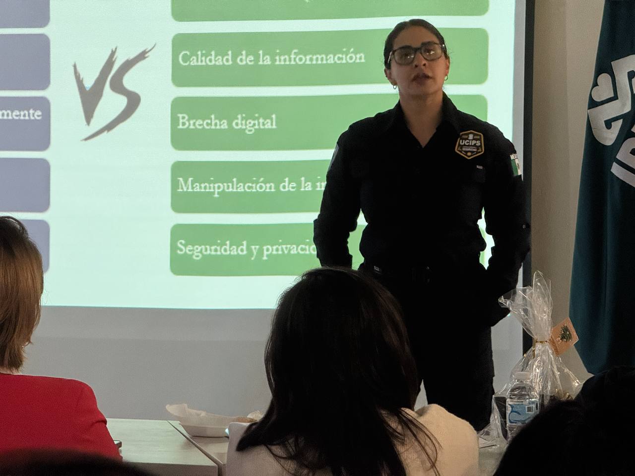 La ponente refirió que la democratización de la información amplía el acceso al conocimiento, pero también demanda atención a factores como la verificación de fuentes; protección de contraseñas; y detección de mensajes o archivos que puedan comprometer la seguridad de las comunidades educativas.
