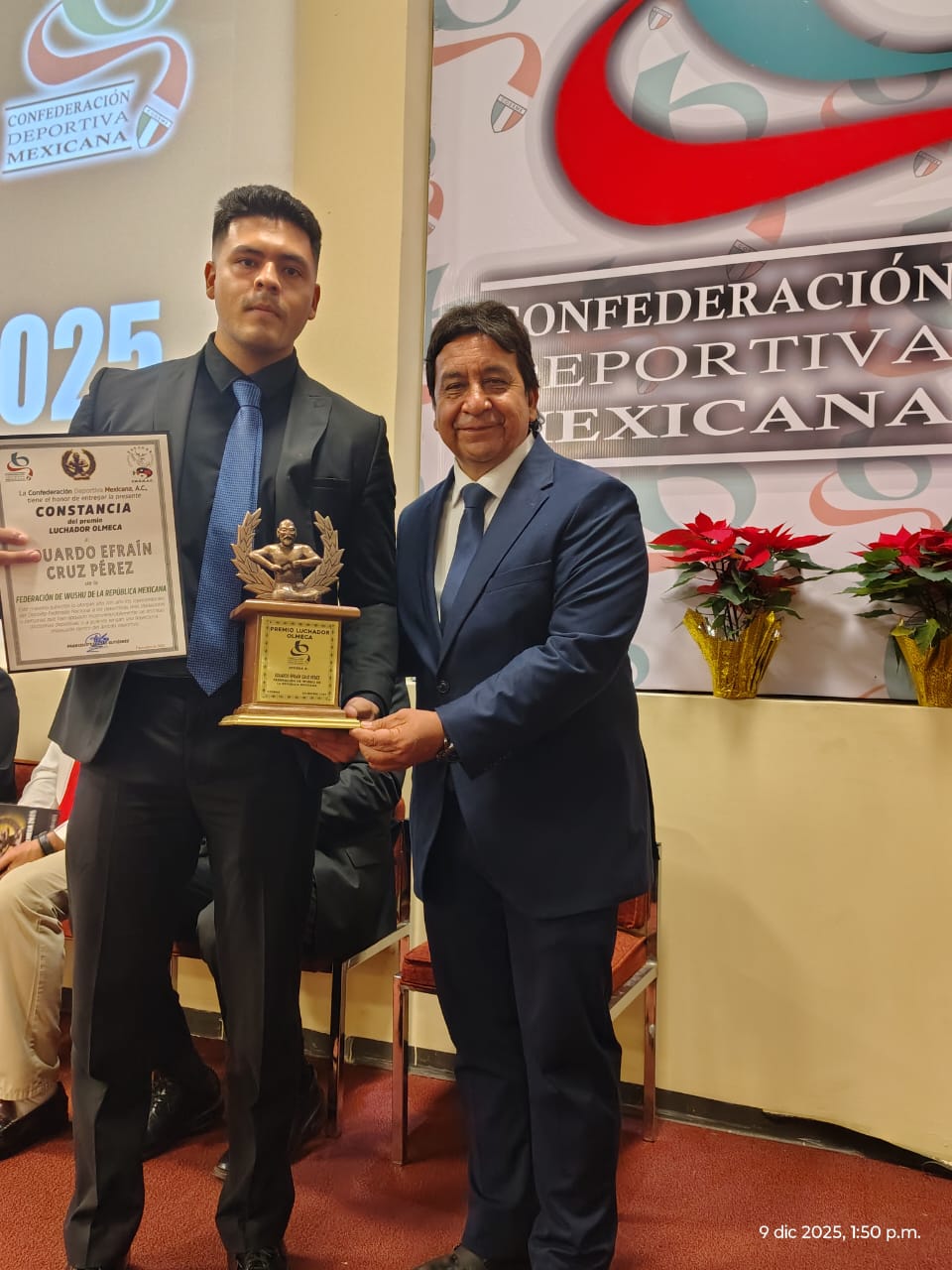 CIUDAD DE MÉXICO.- La Confederación Deportiva Mexicana (CODEME) entregó el reconocimiento a dos destacados representantes poblanos de la disciplina de Wushu, la maestra Elisa Arisbé Millán Rivera y el deportista Eduardo Efraín Cruz Pérez, quienes fueron galardonados con el premio “Luchador Olmeca”, máxima distinción que se entrega por la actividad sobresaliente en el contexto de Investigación Científica, Desarrollo Tecnológico e Innovación en el Deporte.