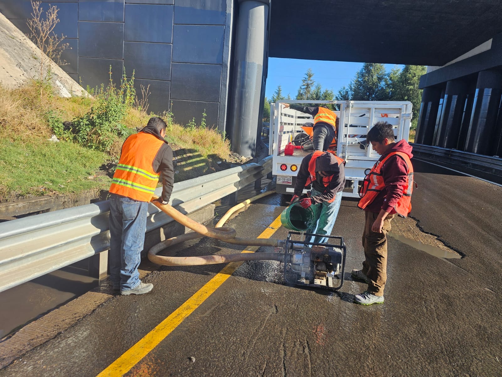 La obra contó con una primera intervención de carácter provisional; actualmente se llevan a cabo labores de demolición y construcción de cajas de captación pluvial, perforación dirigida y colocación de tubería para el drenaje pluvial. En el sitio se dispone de equipo especializado para la extracción de agua, lo que permite avanzar con los trabajos de rehabilitación.