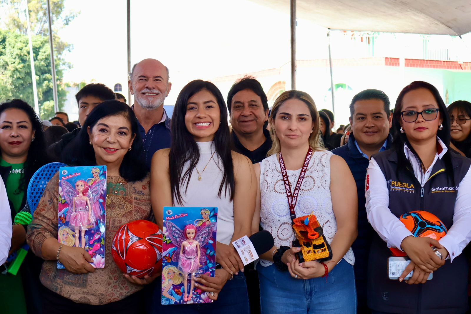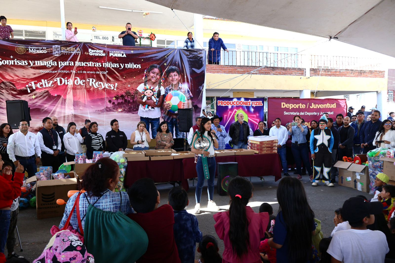 CIUDAD DE PUEBLA, Pue.- Más de mil niñas y niños de la Inspectoría Guadalupe Hidalgo vivieron un día de sonrisas y magia durante la entrega de juguetes y rosca de Reyes Magos, acción realizada de forma simultánea en las 27 microrregiones del estado, por instrucción del ejecutivo estatal Alejandro Armenta.