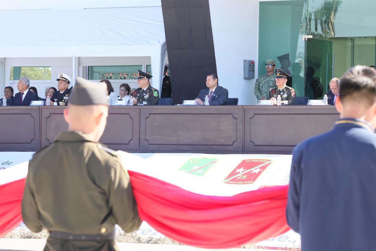 Durante la conmemoración del Día de la Bandera en la explanada de la Escuela Militar de Sargentos, en la XXV Zona Militar, el ejecutivo estatal expresó que el lábaro patrio representa la lucha del pueblo de México por su independencia, la defensa del territorio y la construcción de un país libre.