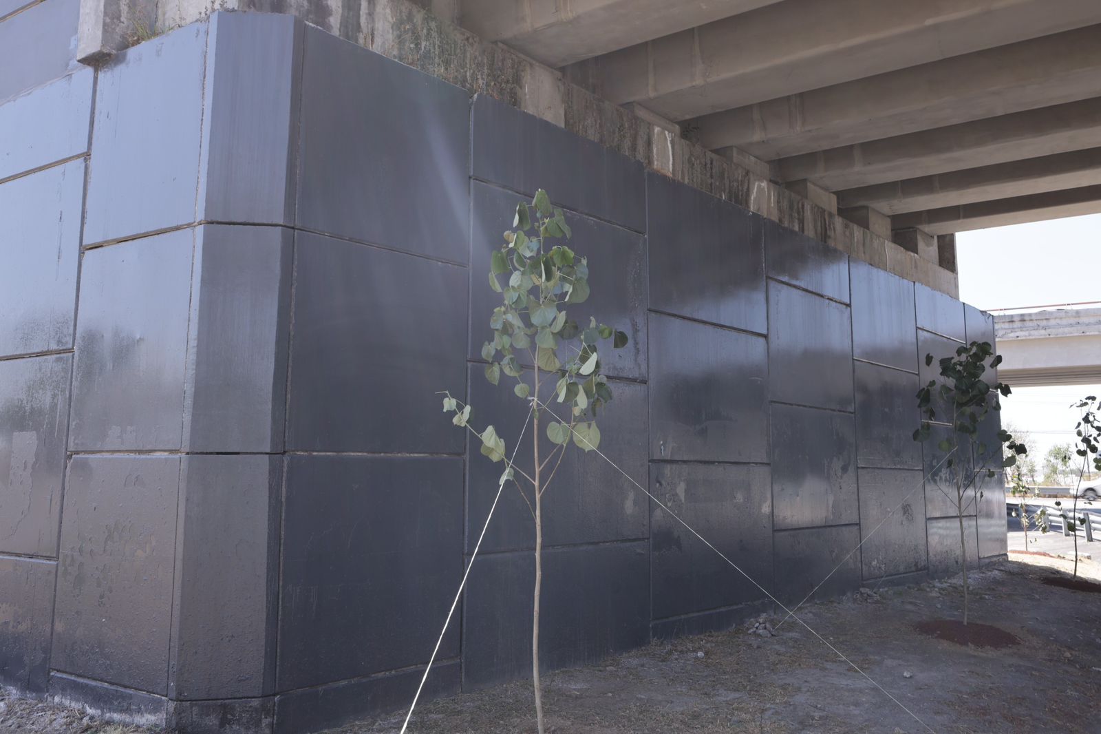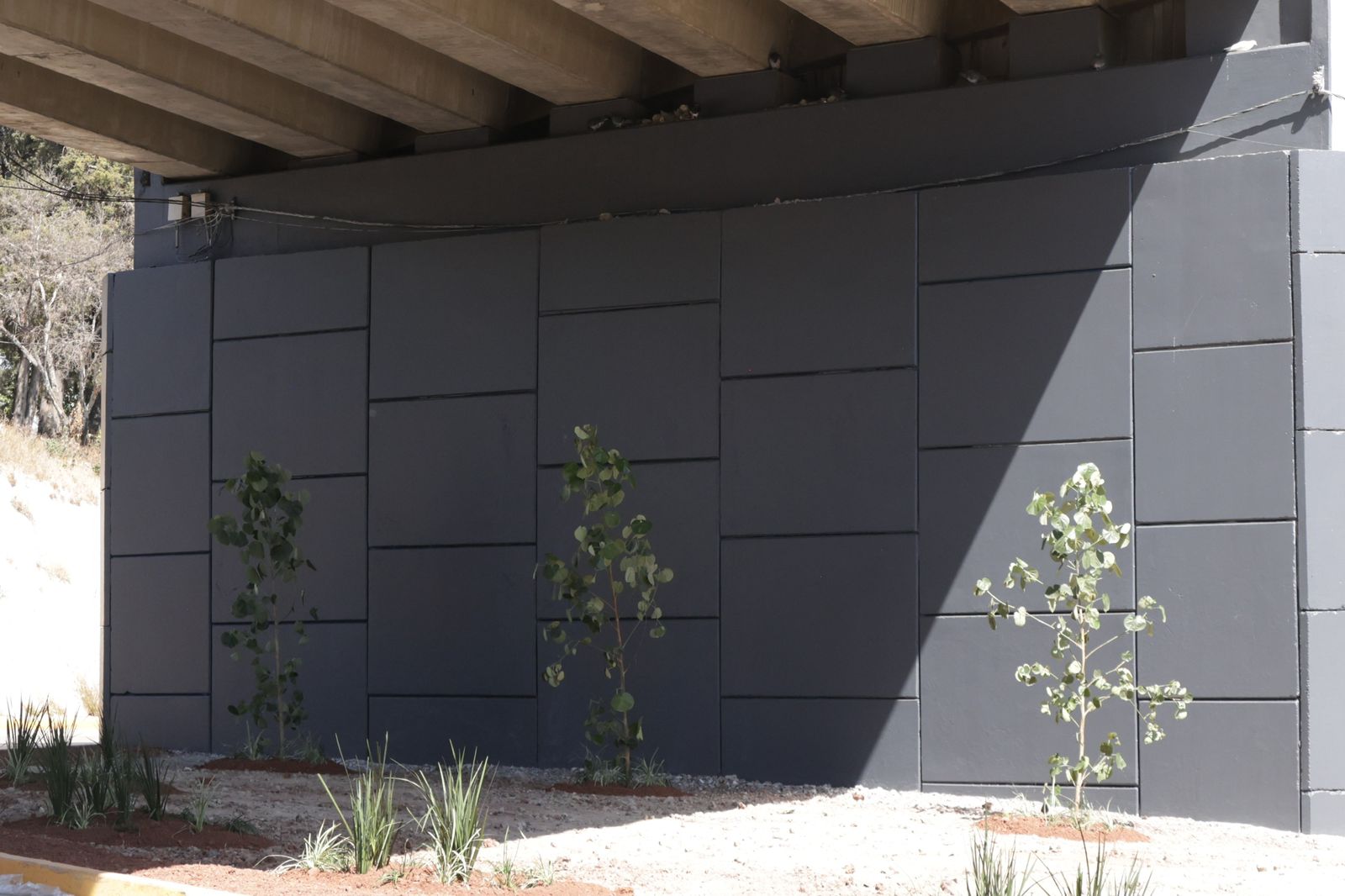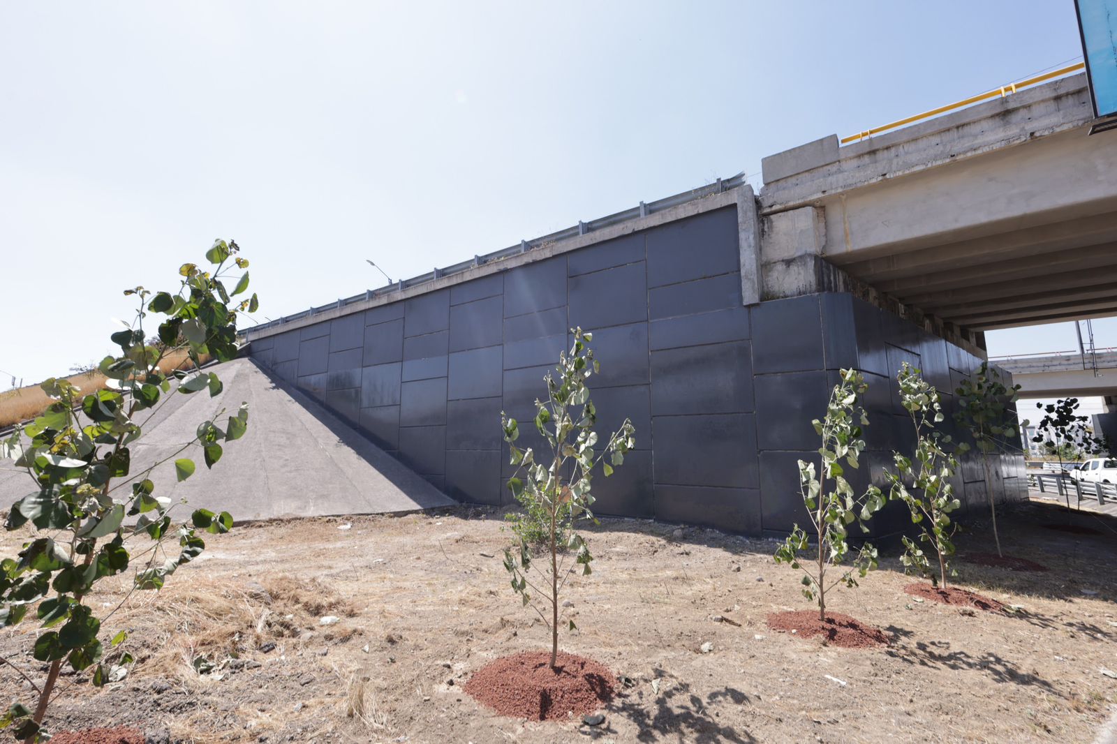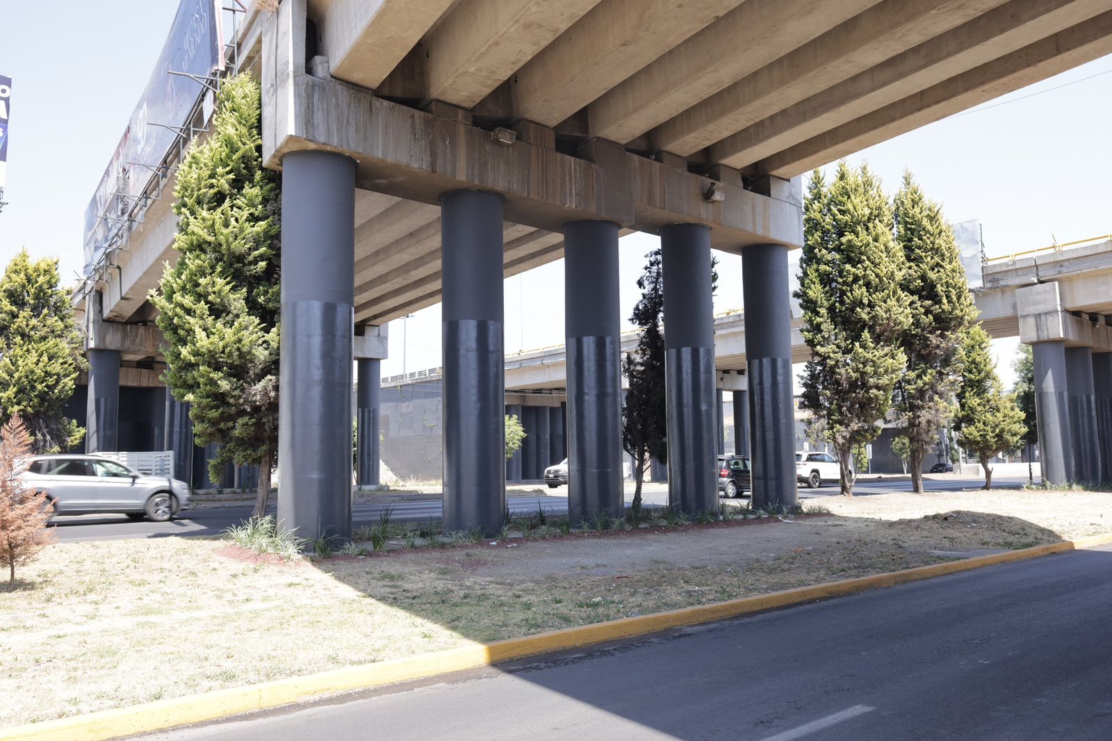 La Secretaría de Infraestructura interviene 23 bajo puentes a lo largo del Periférico Ecológico con cuadrillas que realizan labores como la aplicación de pintura en muros y columnas, diseño de áreas verdes mediante jardinería, instalación de luminarias para mayor seguridad, así como el pintado de guarniciones y rayas divisorias de carriles para mejorar las vialidades.