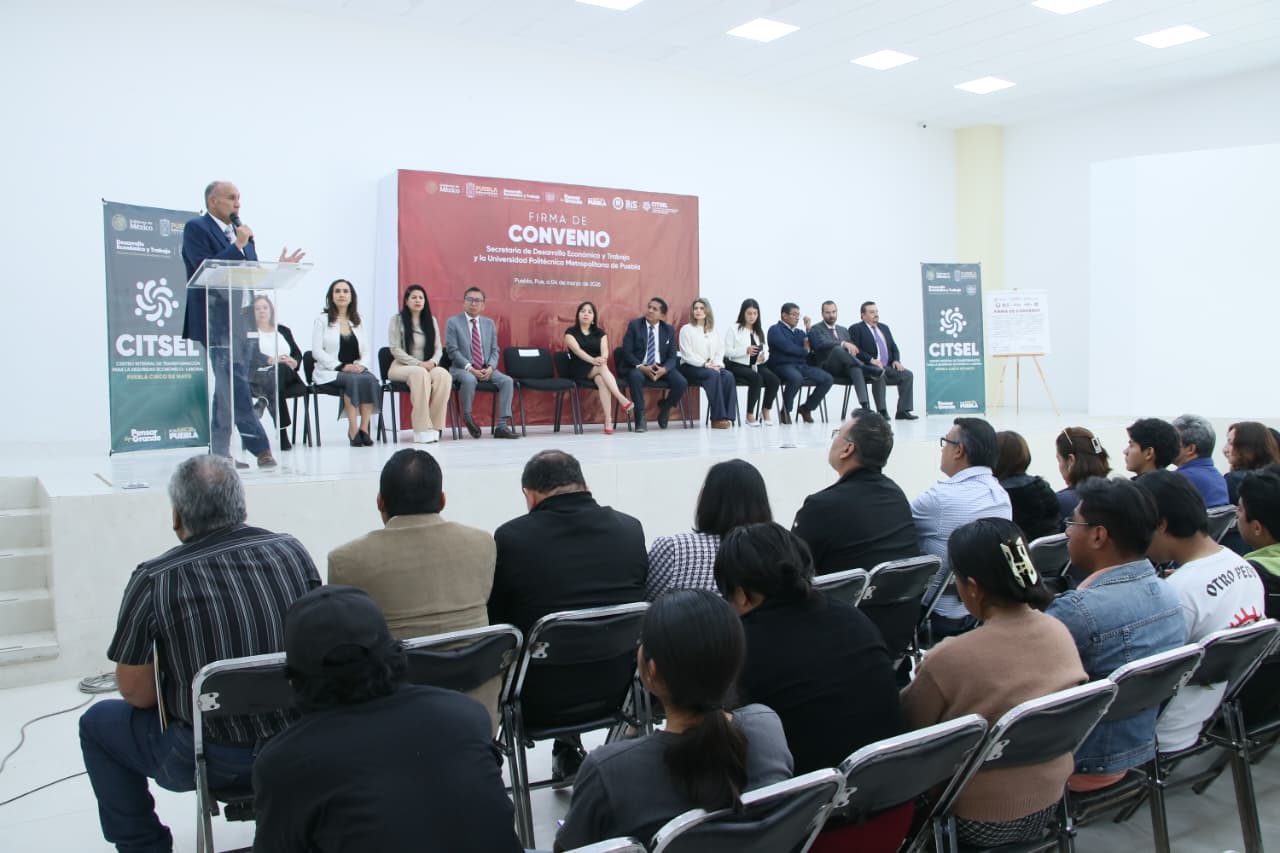 CIUDAD DE PUEBLA, Pue.– Con el propósito de fortalecer la vinculación entre educación superior, empleo formal, así como el desarrollo económico regional, la Secretaría de Desarrollo Económico y Trabajo formalizó la firma de convenio para la instalación del Centro Integral de Transformación y Seguridad Económico-Laboral (CITSEL) Puebla Cinco de Mayo en la Universidad Politécnica Metropolitana de Puebla (UPMP), a fin de acercar servicios estratégicos a la comunidad universitaria y a la población del sur de la capital.