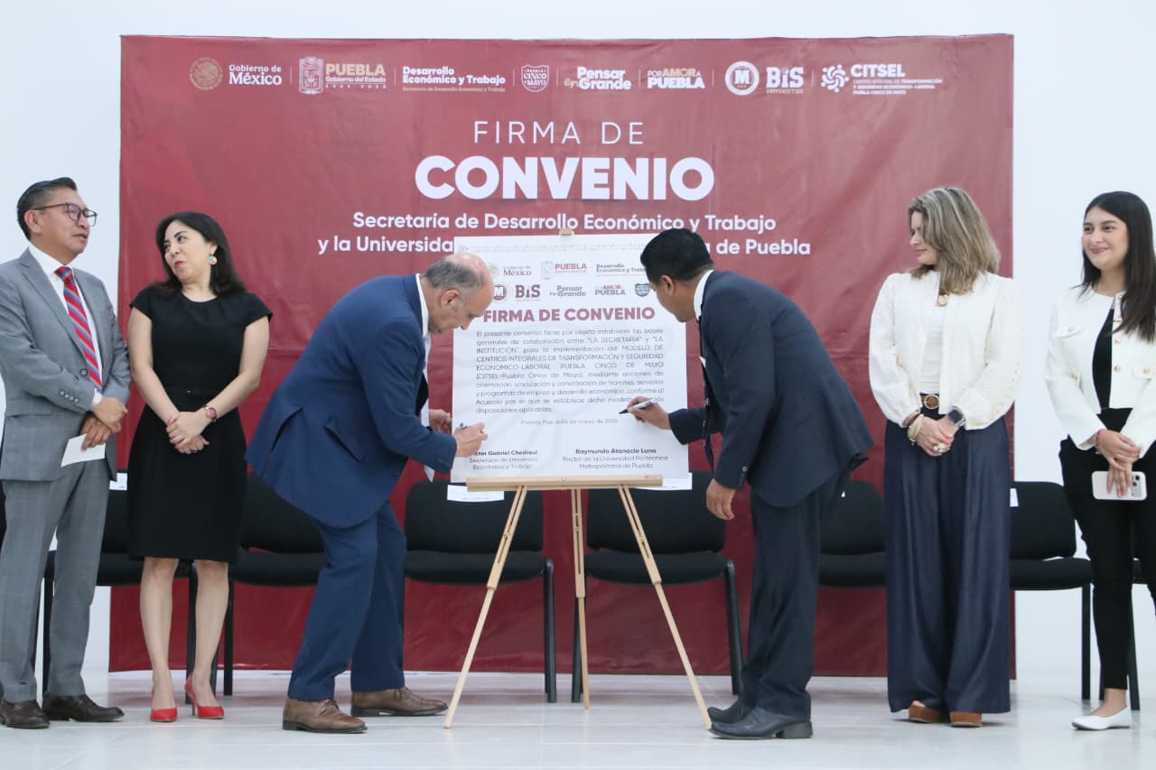 El acuerdo establece las bases generales de colaboración entre la dependencia estatal, la Universidad Politécnica Metropolitana de Puebla y el Instituto Mexicano de la Propiedad Industrial para implementar el modelo CITSEL Puebla Cinco de Mayo durante 2026. El secretario de Desarrollo Económico y Trabajo, Víctor Gabriel Chedraui, precisó que este esquema contempla acciones de orientación, vinculación y canalización de trámites, así como acceso a programas de empleo y fortalecimiento empresarial.