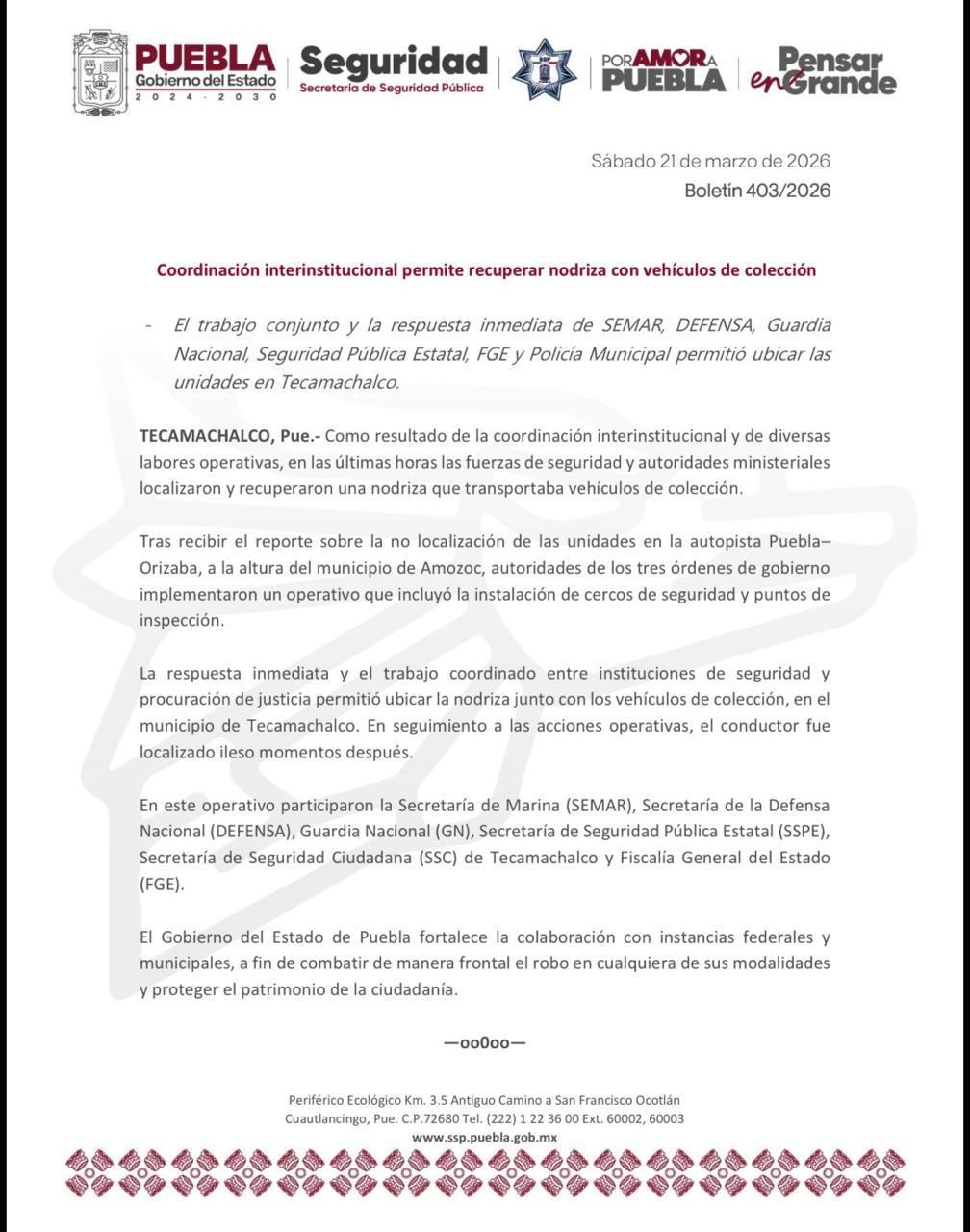 La respuesta inmediata y el trabajo coordinado entre instituciones de seguridad y procuración de justicia permitió ubicar la nodriza junto con los vehículos de colección, en el municipio de Tecamachalco. En seguimiento a las acciones operativas, el conductor fue localizado ileso momentos después.