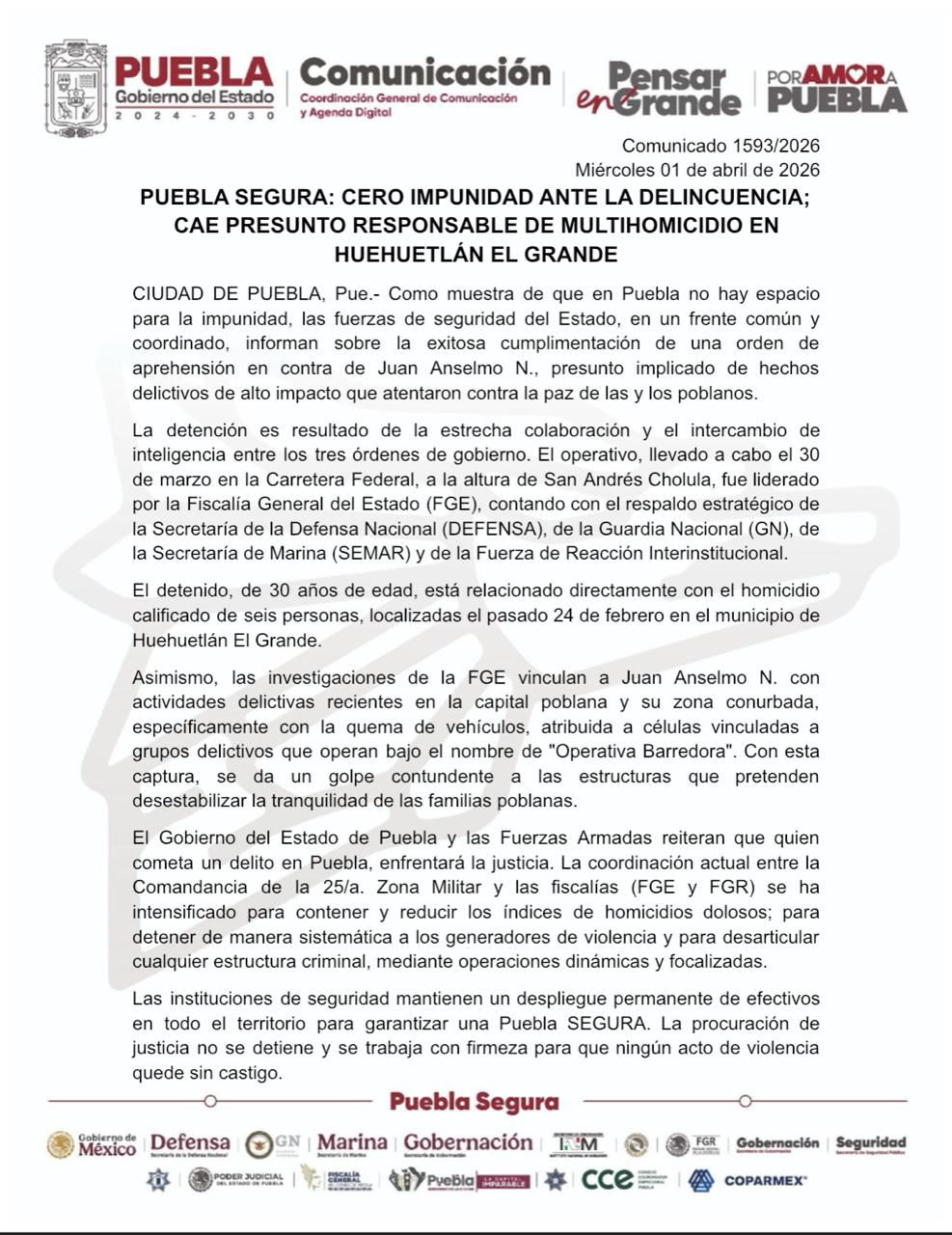 Asimismo, las investigaciones de la FGE vinculan a Juan Anselmo N. con actividades delictivas recientes en la capital poblana y su zona conurbada, específicamente con la quema de vehículos, atribuida a células vinculadas a grupos delictivos que operan bajo el nombre de "Operativa Barredora". Con esta captura, se da un golpe contundente a las estructuras que pretenden desestabilizar la tranquilidad de las familias poblanas.