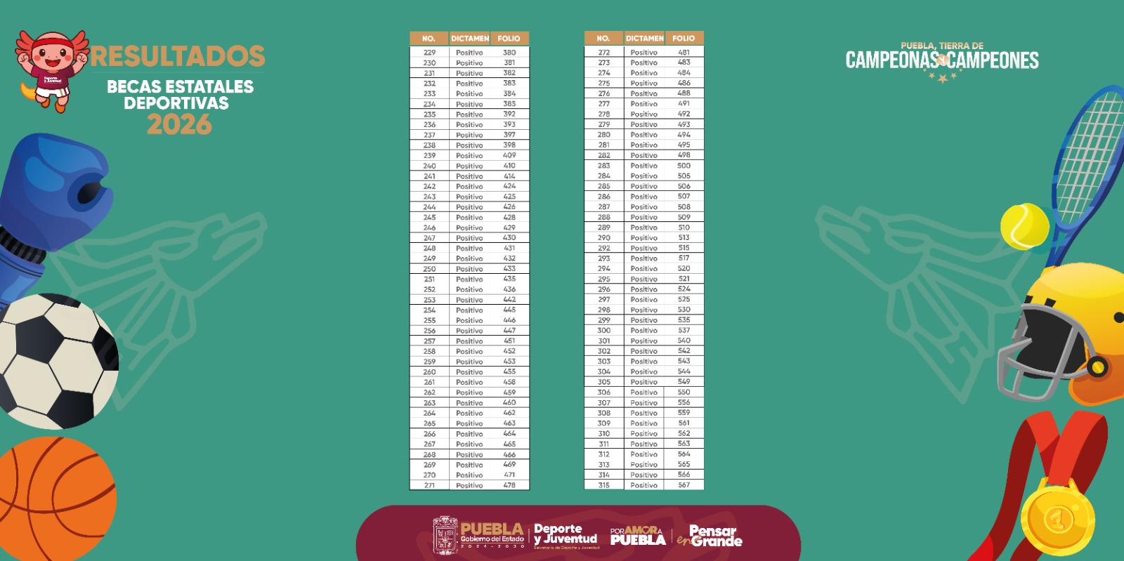 CIUDAD DE PUEBLA, Pue. - Como parte del apoyo que brinda el gobernador Alejandro Armenta Mier a las y los deportistas poblanos para su desarrollo integral, la Secretaría de Deporte y Juventud da a conocer los resultados de las y los aspirantes a becas deportivas 2026.