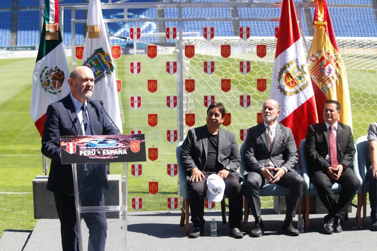 CIUDAD DE PUEBLA, Puebla. - "En Puebla ya empezó el mundial", aseguró el director general de la Comisión Nacional de Cultura Física y Deporte (CONADE), Rommel Pacheco, al anunciar junto con el gobernador Alejandro Armenta Mier, el partido amistoso internacional entre las selecciones de Perú y España, que se llevará a cabo el próximo 8 de junio, lo anterior como parte de la preparación rumbo a la Copa del Mundo 2026.