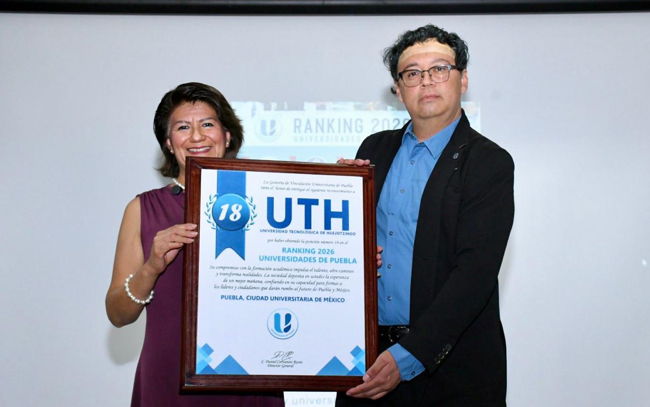 HUEJOTZINGO, Pue. — La Universidad Tecnológica de Huejotzingo (UTH) recibió el galardón que la ubica en el lugar número 18 de las mejores instituciones de educación superior del estado. Con esta distinción, otorgada por Universidades de Puebla, organismo dedicado a medir la calidad y evaluar programas educativos, la casa de estudios refrenda su compromiso con la formación de profesionistas de calidad.