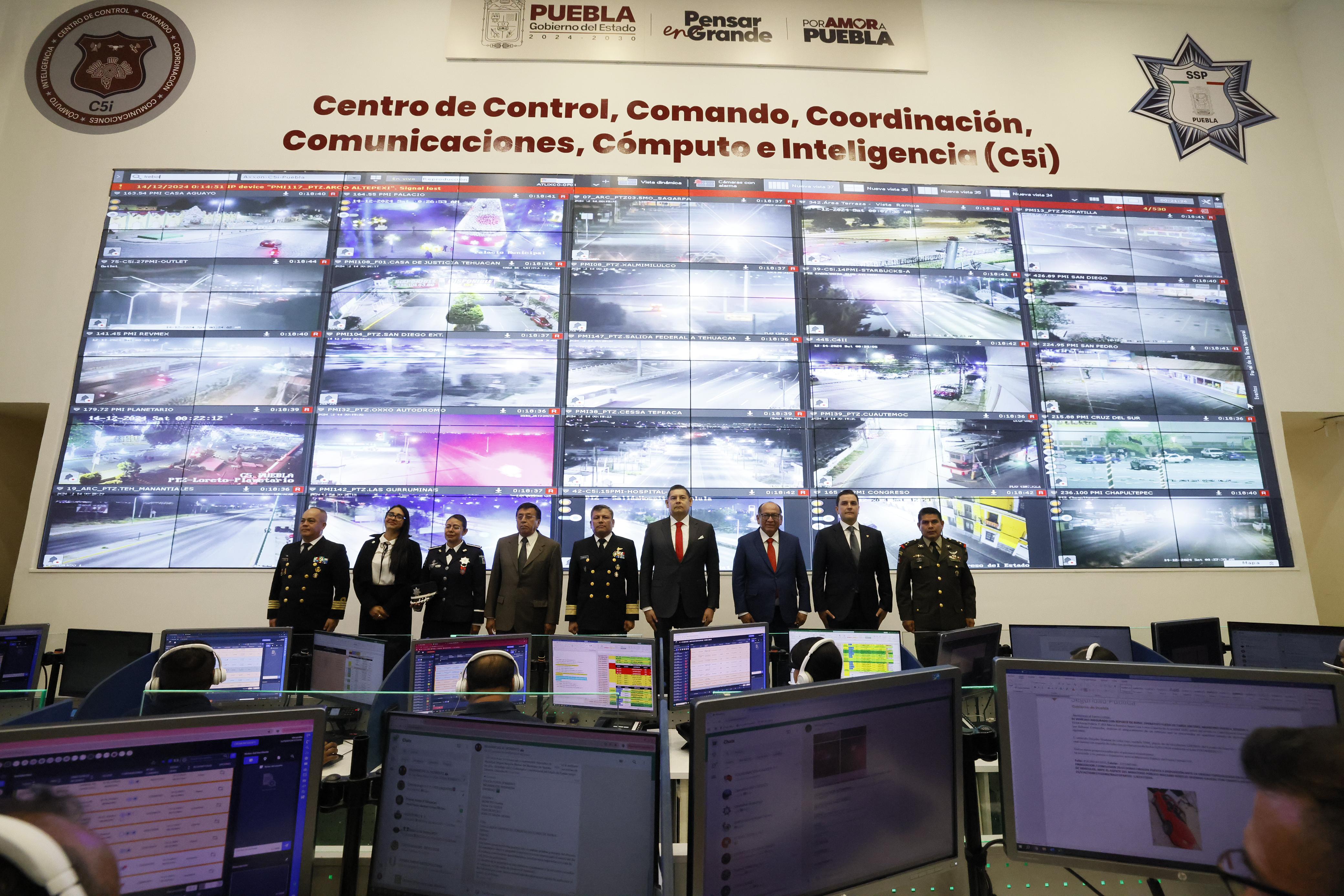 Posterior a la ceremonia de cambio de mando, el gobernador electo, Alejandro Armenta Mier, acompañado del titular de la SSP, vicealmirante Francisco Sánchez González, así como de subsecretarios y directivos de la dependencia, realizó un recorrido por el Centro de Control, Comando, Coordinación, Comunicaciones, Cómputo e Inteligencia (C5i).