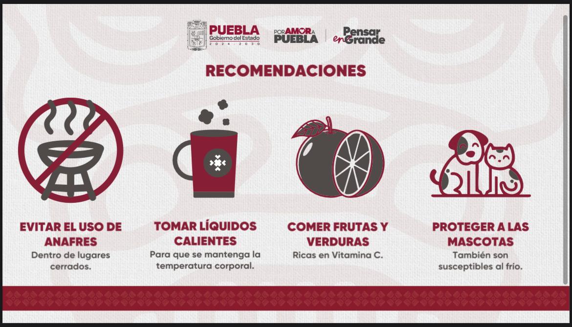 Finalmente, López Santos exhortó a la población en general a seguir las recomendaciones correspondientes durante esta temporada y abrigarse con ropa gruesa y calzado cerrado, evitar cambios bruscos de temperatura, no realizar actividades al aire libre, no hacer uso de anafres o braseros en lugares cerrados, proteger a las mascotas y consumir agua y frutas y verduras.