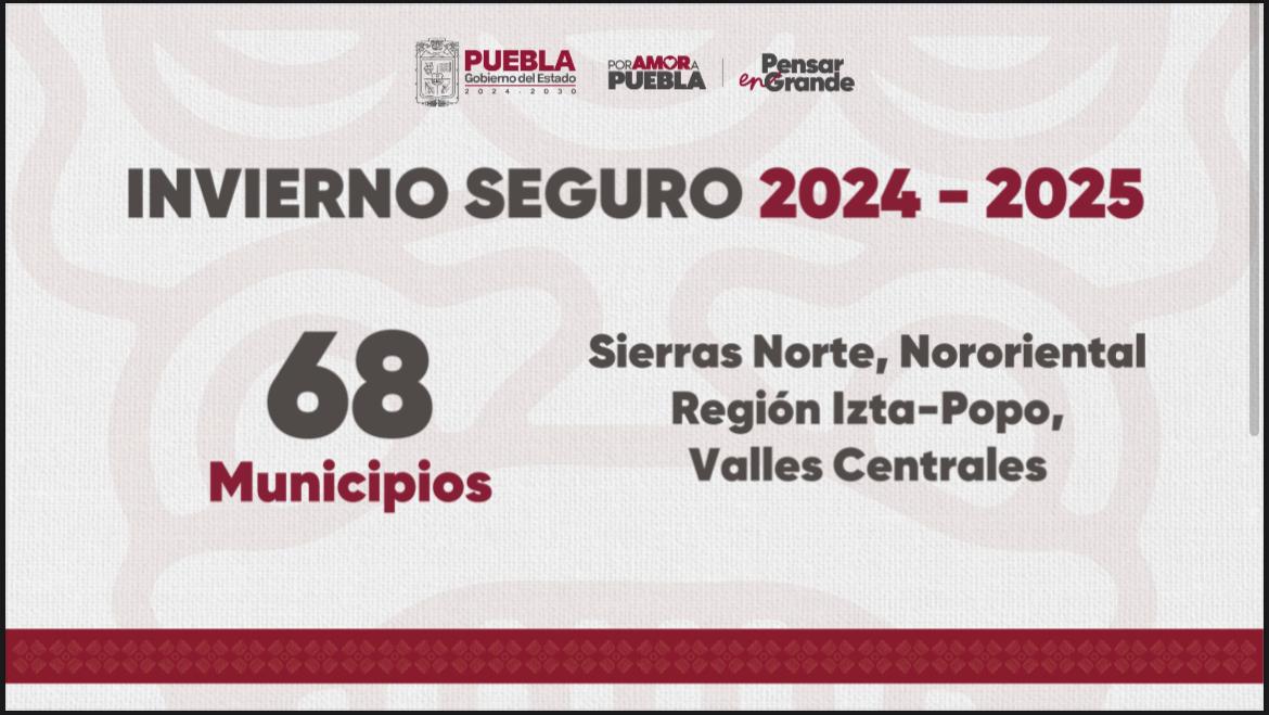 CIUDAD DE PUEBLA, Pue.- El Gobierno del Estado, a través de la Secretaría de Gobernación y de la Coordinación General de Protección Civil y Gestión de Riesgo de Desastres, ha implementado el programa especial “Invierno Seguro” 2024-2025 que opera ya en 68 municipios de la entidad, con el objetivo de resguardar la salud e integridad de las y los ciudadanos más vulnerables, así lo dio a conocer el coronel, Bernabé López Santos, titular del área preventiva.